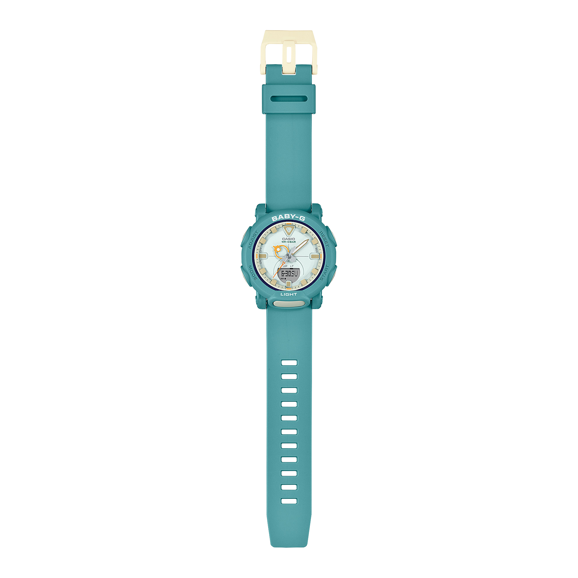 Explore the great outdoors in style with BABY-G BGA-310RP-3ADR. This retro-inspired watch features matte colors and a camping lantern motif, adding a cute accent to your casual look. The wide face and glow-in-the-dark details make it easy to read, while the bio-based resin construction supports environmental sustainability. Practical and fashionable, this watch satisfies both your adventurous spirit and love for vintage pop fashion.