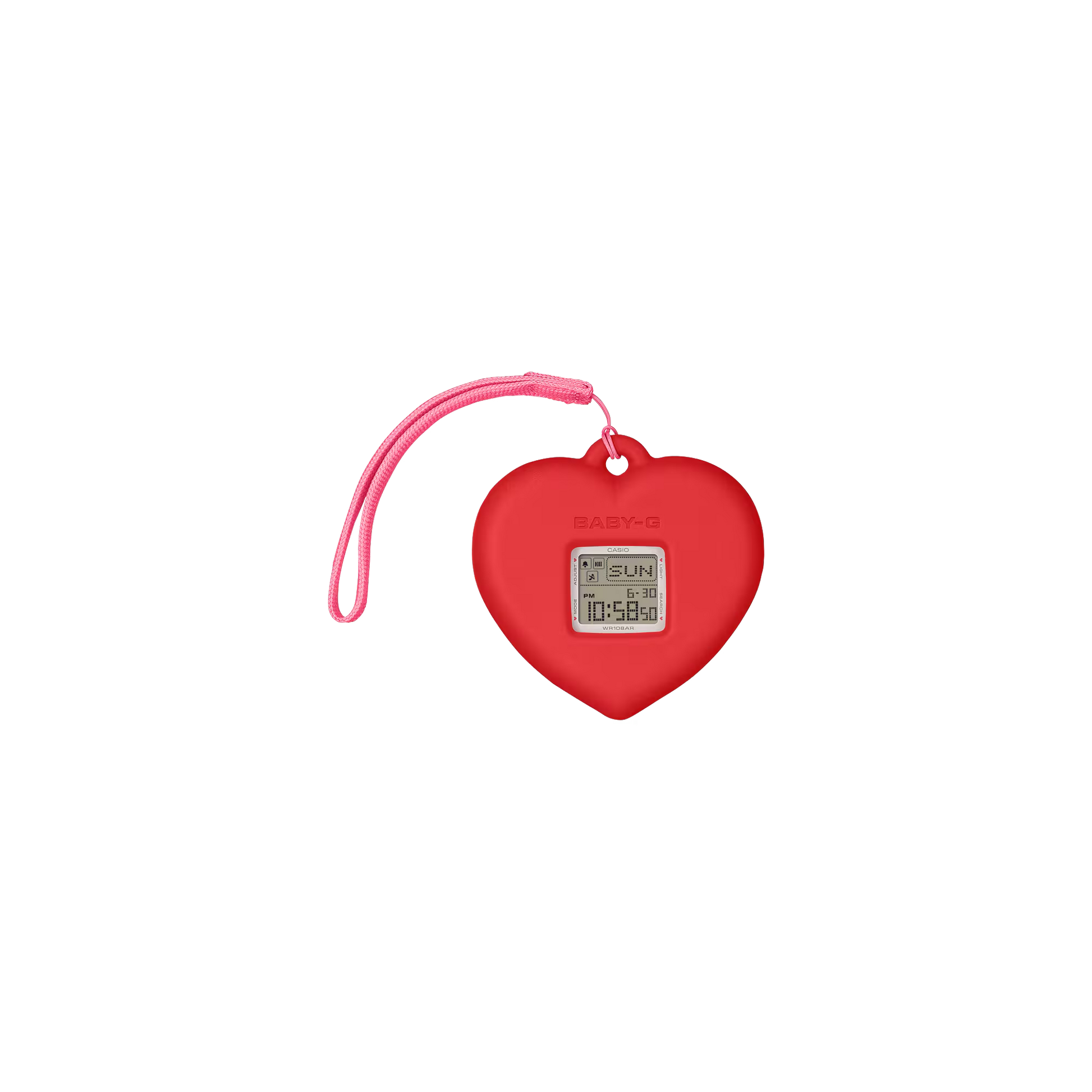 The BABY-G+PLUS BGD-10KH-7DR redefines casual timekeeping with its innovative convertible design. This Valentine's-inspired watch transitions seamlessly from wristwatch to decorative charm, fitting snugly into an included heart-shaped silicone holder. Personalize your accessory by adding stickers and embellishments to the holder for a truly individual style. Press the illumination button to reveal a charming heart icon on the LCD display. Built for durability, this timepiece features shock-resistant construction and 100-meter water resistance, making it equally suited for everyday wear and water activities. Perfect for those seeking both playful aesthetics and reliable performance.