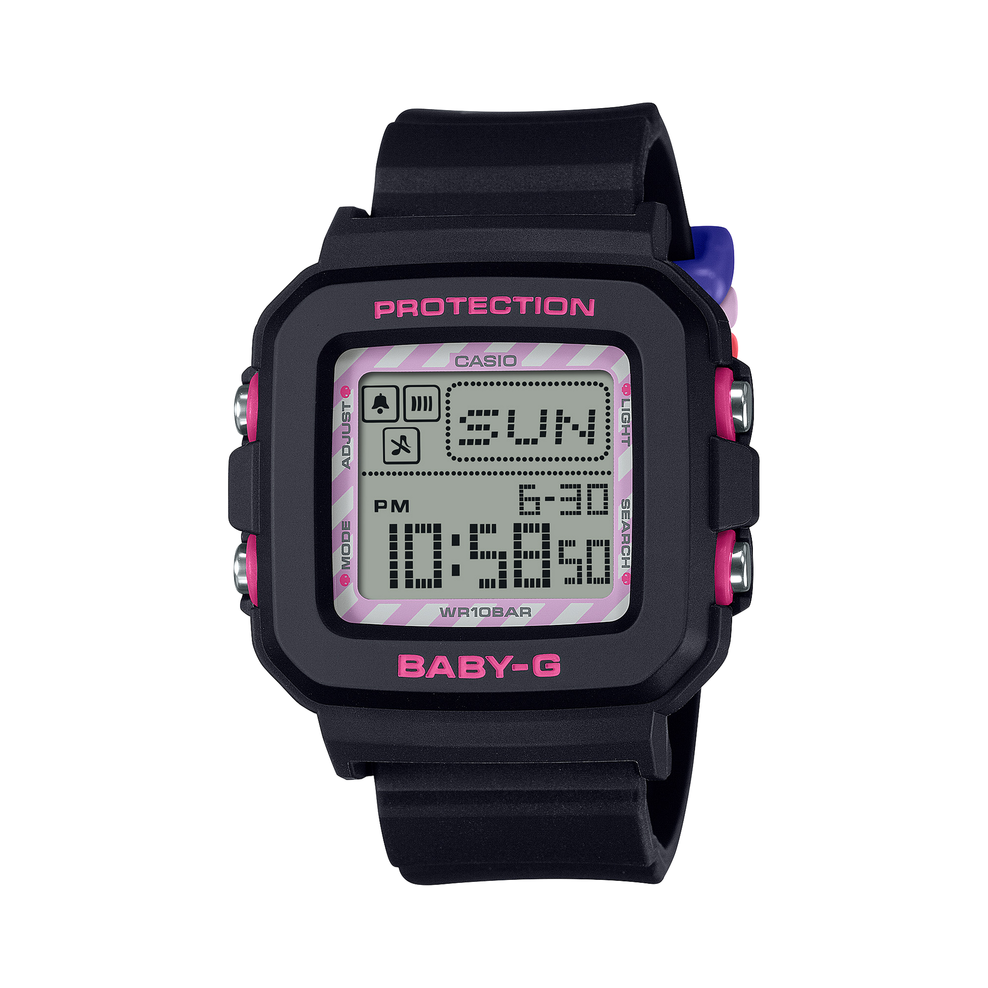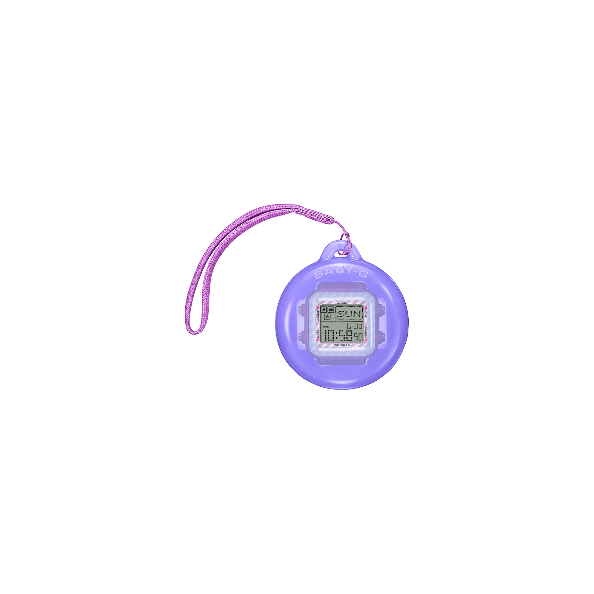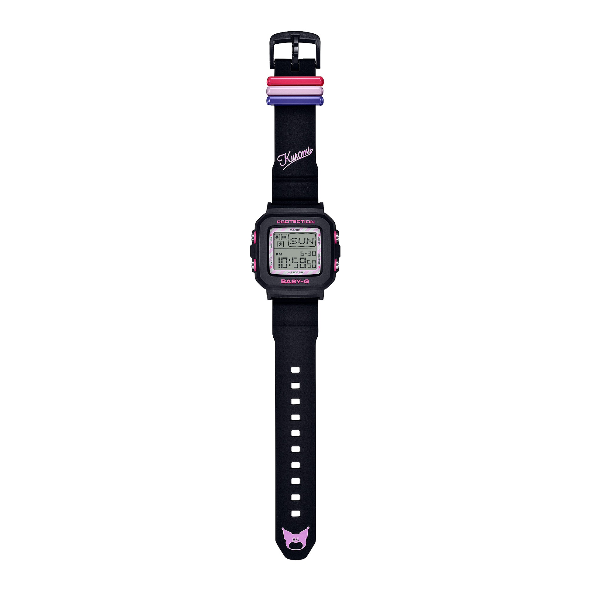Introducing the BABY-G + Plus Case Holder Set Kuromi Collaboration Model BGD-10KKM-1DR. Celebrating BABY-G's 30th anniversary, this special edition features a versatile digital wristwatch with a unique charm holder. The playful design showcases KUROMI with a backlight option that reveals her adorable face. The strap also reveals a cute image of KUROMI. Limited edition engraved case back completes this special collaboration.