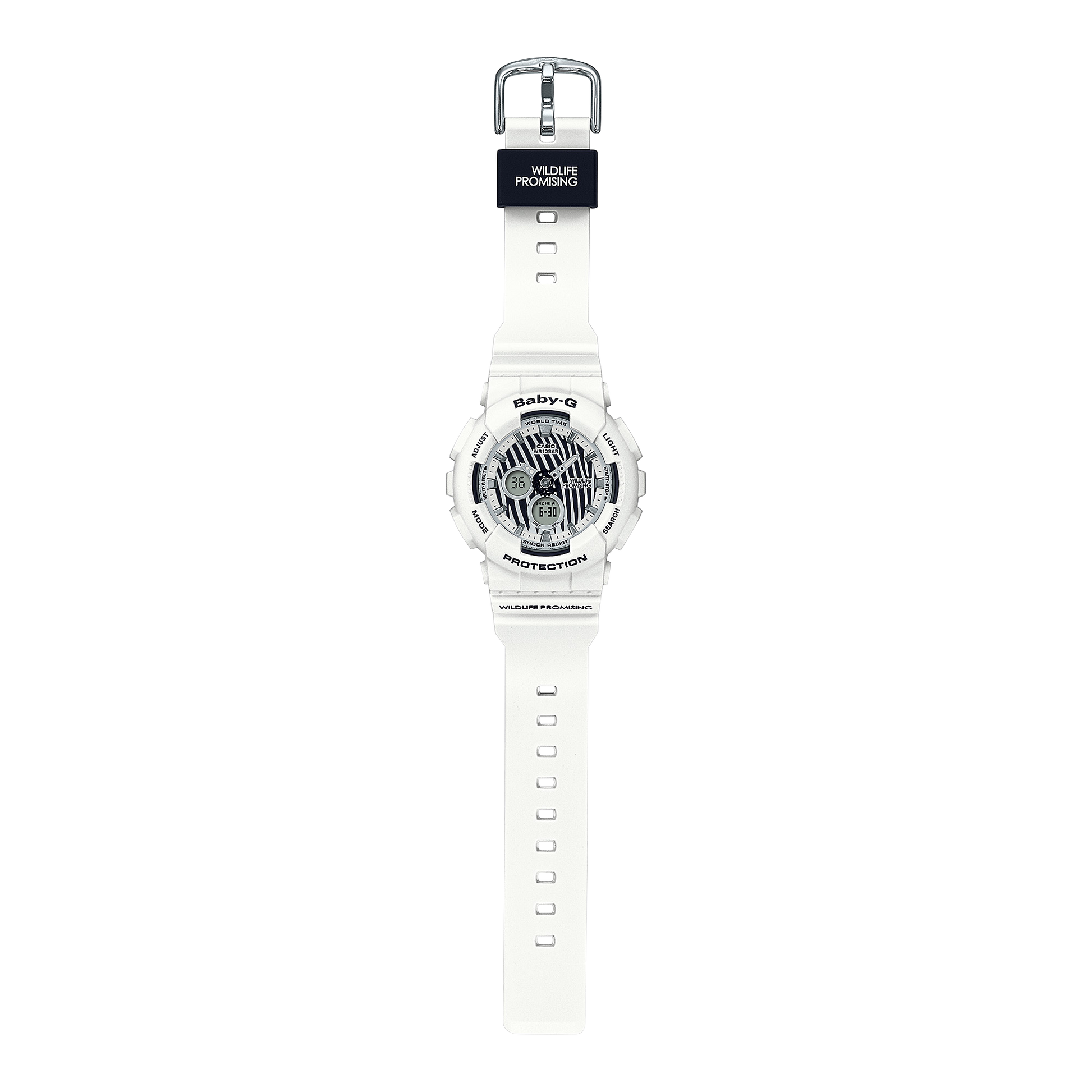 Discover the BABY-G WILDLIFE PROMISING WOMEN COLLABORATION WATCH and join the movement to protect endangered species. The delicate black and white stripes of the Grevy's zebra, native to Kenya, inspire the design of this set. With the Wildlife Promising logo on the band and band loop, and a reminder to "Love the Sea and the Earth" engraved on the case back, this watch celebrates conservation in a stylish and meaningful way.