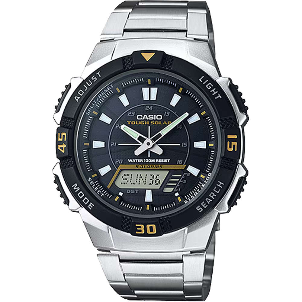 Effortlessly keep time and stay on schedule with the CASIO ANALOG-DIGITAL MENS WATCH AQ-S800WD-1EVDF. Utilizing tough solar technology, this watch is equipped with a 1/100-second stopwatch, world time feature, 5 alarms, and a 100-meter water resistance. The LED light and 6-language day of the week indicator make it perfect for any active lifestyle, while maintaining a sleek and sporty design.