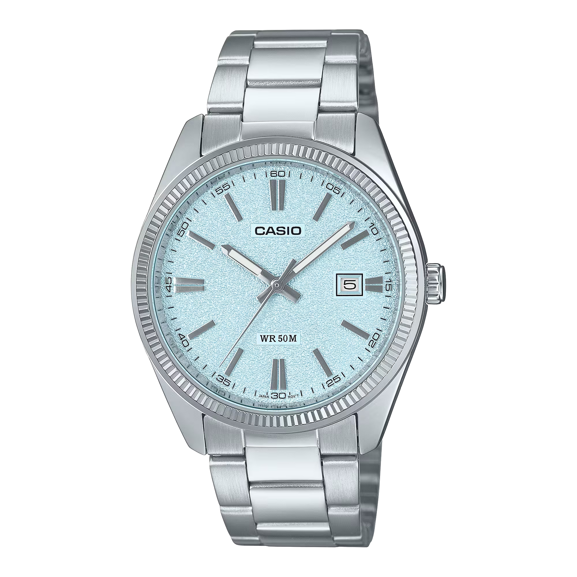 ・Matte dial with textured finish ・Stainless-steel band ・Date display ・50-meter water resistance