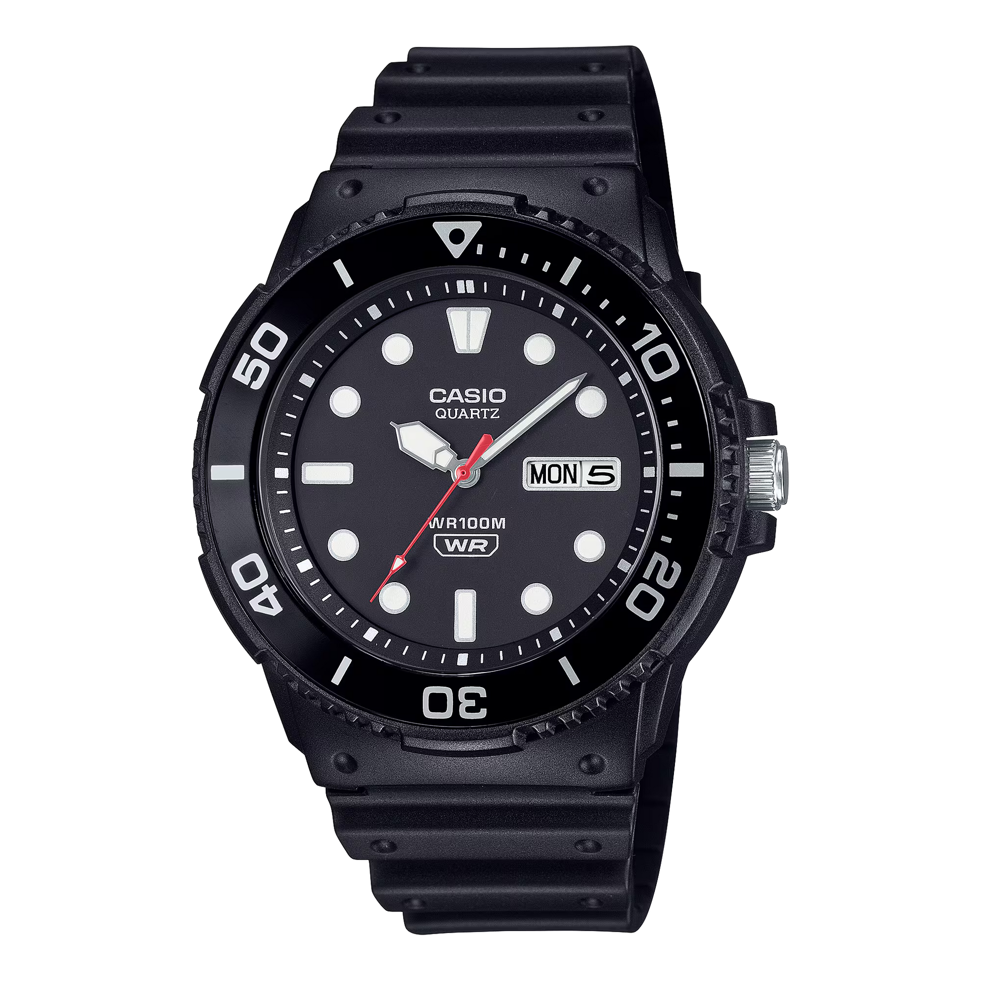 Discover the perfect blend of style and functionality with the CASIO ANALOG MENS WATCH MRW-230H-1E1VDF. This marine-inspired analog watch features a rotating bezel with an aluminum ring that reflects light for a bold and eye-catching touch. With water resistance up to 100 meters and a date-day display, this watch offers both practicality and a modern, sleek design. Get ready to make a statement with this must-have watch.