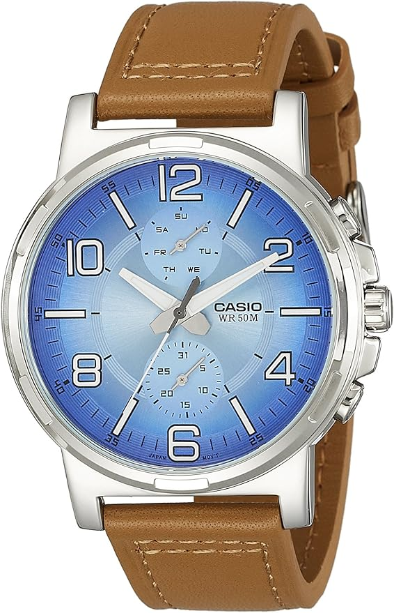 This CASIO ANALOG MENS WATCH MTP-E313L-2B2VDF is designed with water-resistant materials, ensuring durability and longevity even through water exposure. This feature provides peace of mind and convenience for both daily wear and outdoor activities.
