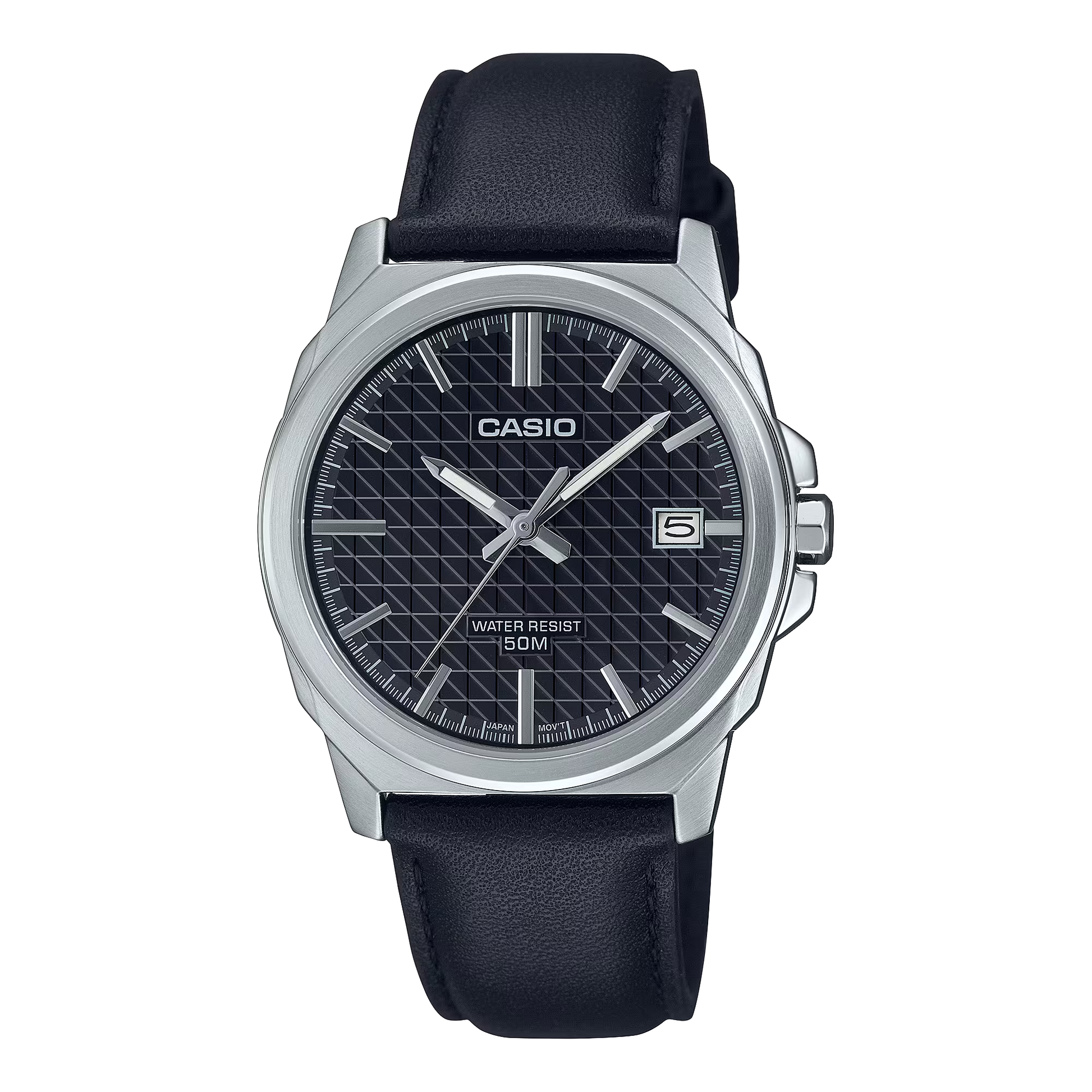 Upgrade your style with the CASIO ANALOG MENS WATCH MTP-E720L-1AVDF. The textured grid pattern on the dial adds a touch of sophistication to the simple and modern design. With water resistance up to 50 meters, you can confidently wear this watch even on rainy days. Plus, the easy-read date display makes it convenient for daily use. Elevate your look with this chic and elegant timepiece.