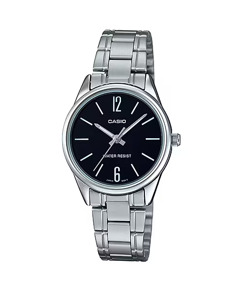 This CASIO analog women's watch, model LTP-V005D-1BUDF, is water resistant and boasts a durable stainless steel band. Its sleek design and functionality make it the perfect everyday accessory for any woman. Stay on time and in style with this reliable watch.