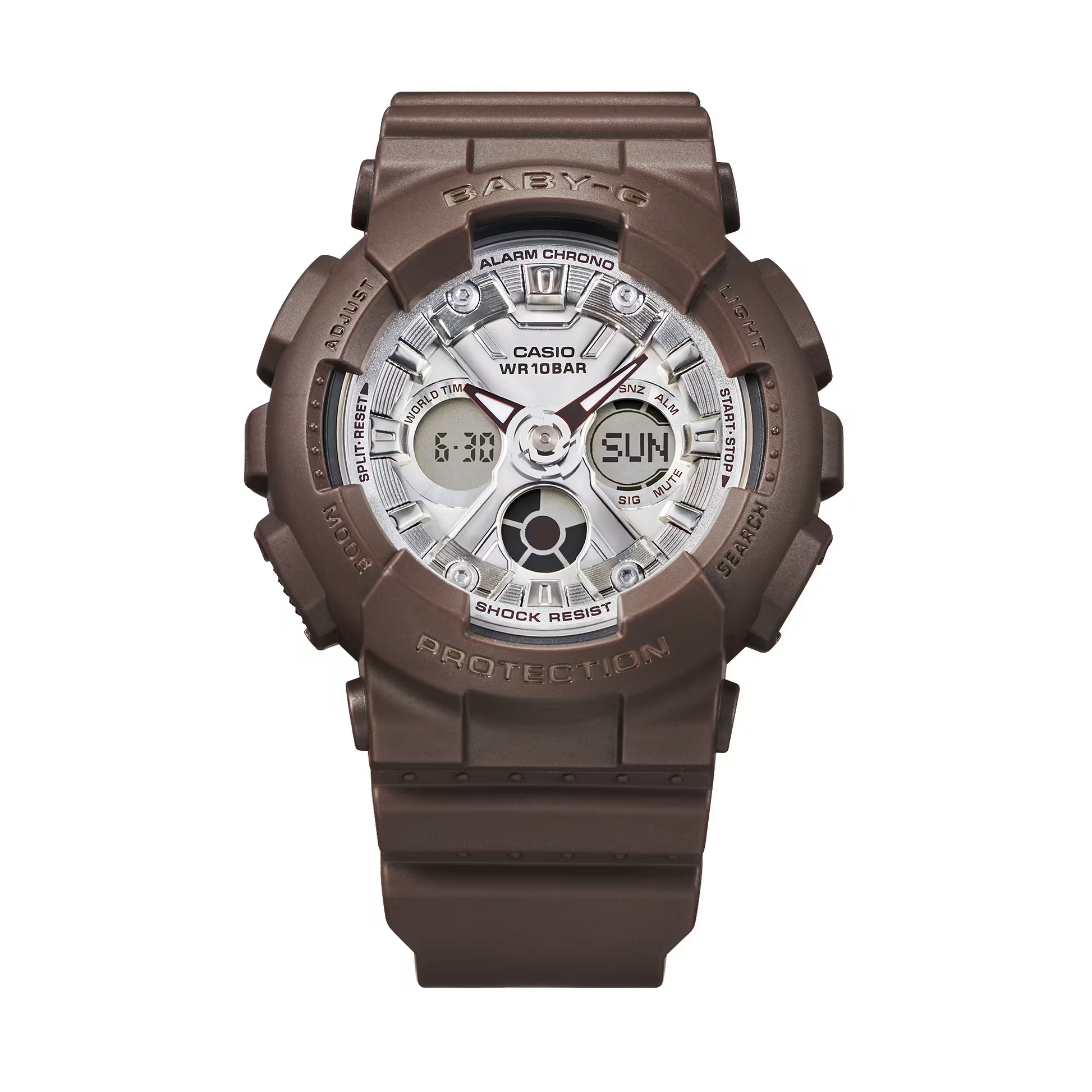 Experience the perfect blend of style and durability with the BABY-G CASUAL WOMEN WATCH BA-130SW-5ADR. Featuring a deep matte brown case and band paired with a shiny dial finished in mirror vapor deposition, this watch captures the essence of rich dark chocolate wrapped in silver foil. Beyond its elegant design, it offers shock-resistant construction and 100-meter water resistance, ensuring reliable performance for everyday wear. Ideal for those seeking a sophisticated yet practical accessory.