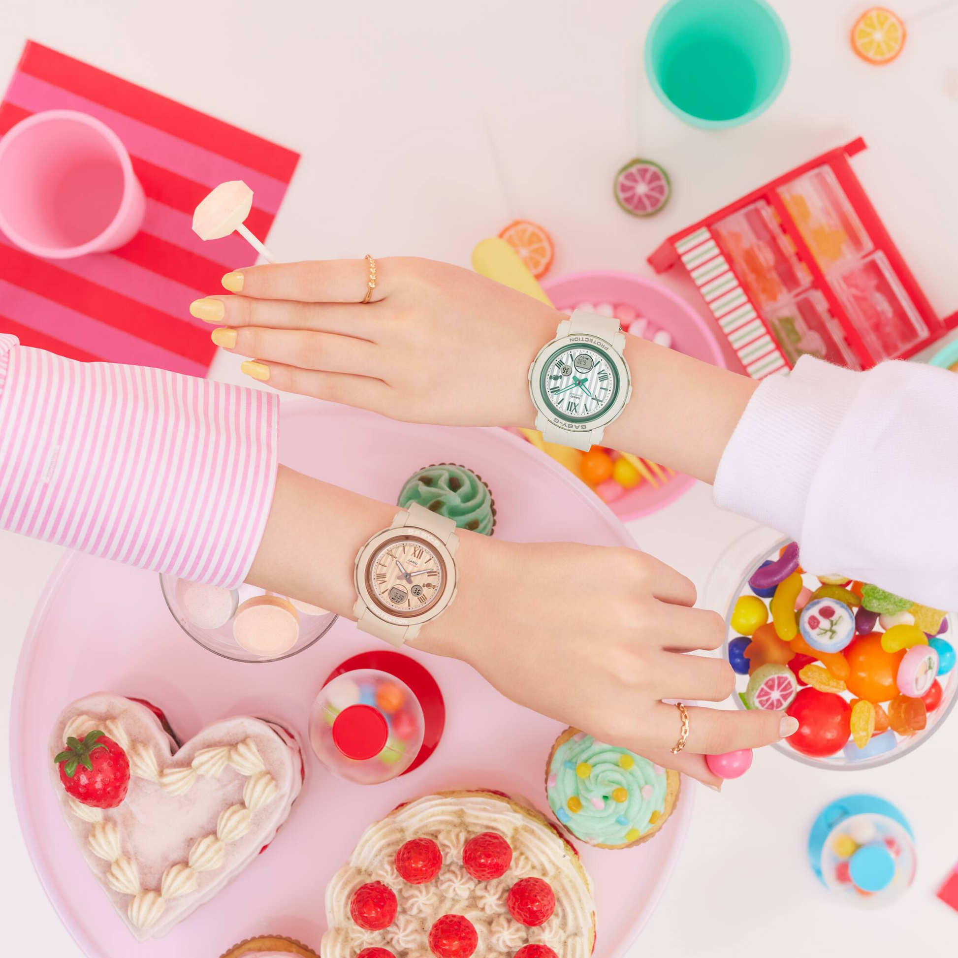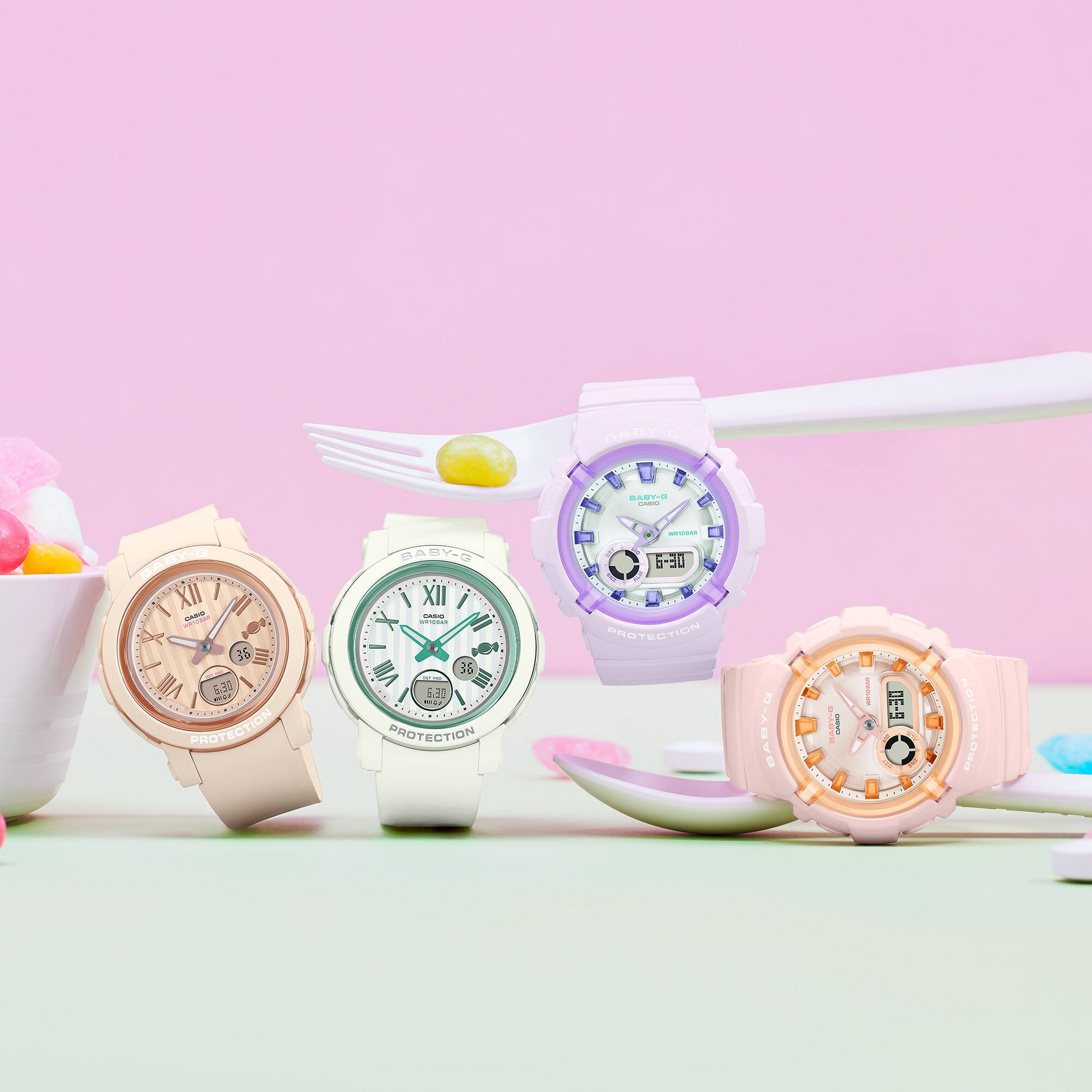 The BABY-G CASUAL WOMEN WATCH BGA-290SW-7ADR combines playful design with robust functionality. Featuring a striped dial accented by a metallic bezel and index marks, its candy wrapper motif is highlighted by a unique candy icon at the 3 o’clock position. Engineered for durability, this watch offers shock resistance and 100-meter water resistance, making it an ideal accessory for everyday wear with a touch of whimsical charm.