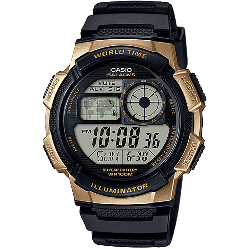 The CASIO DIGITAL MENS WATCH AE-1000W-1A3VDF is designed for long-lasting use, with a 10-year battery life. Stay on time no matter where you are in the world with the world map feature for world time. Stay organized and efficient with the 1/100-second stopwatch and 5 alarms. The LED light and 100-meter water resistance make this watch functional in any environment.