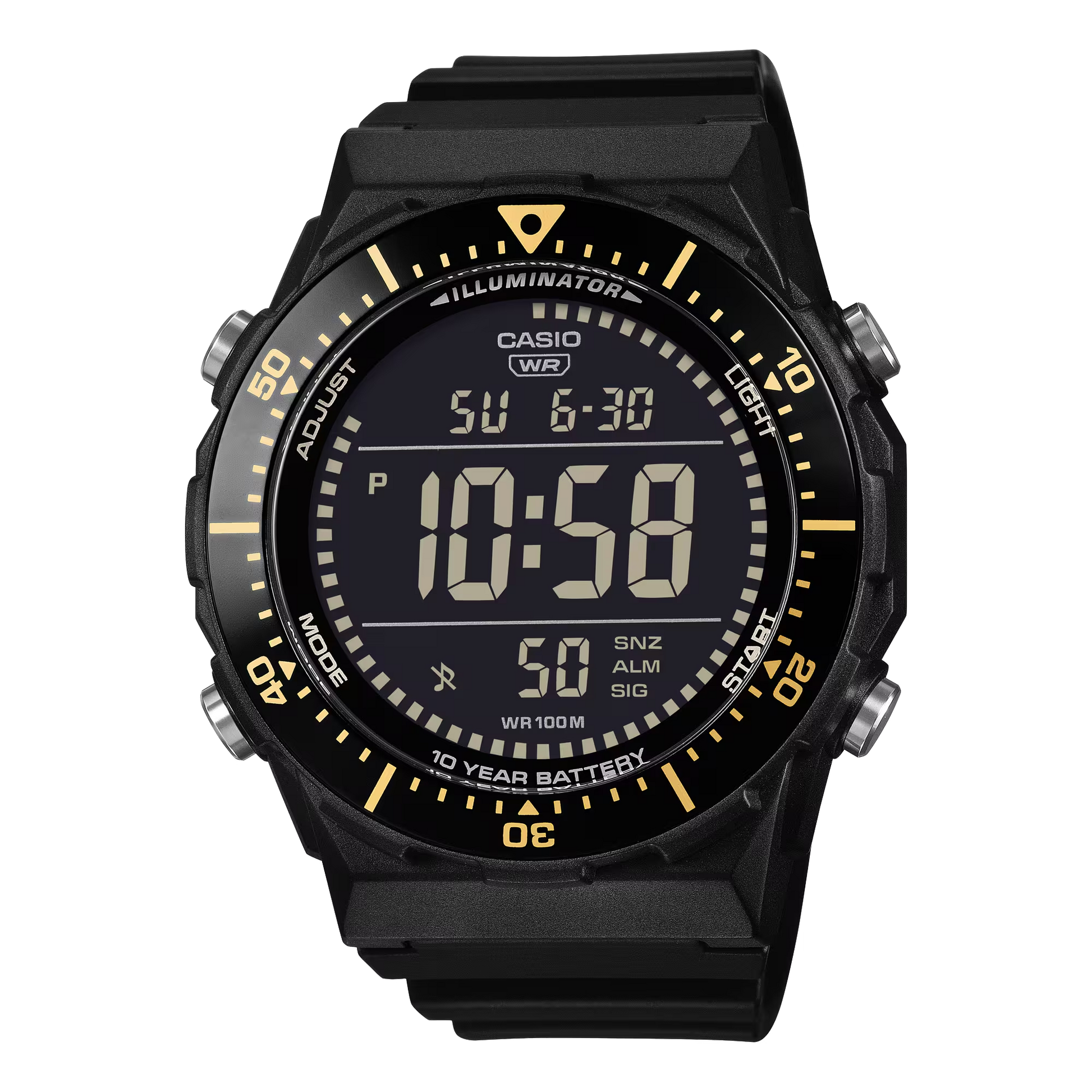 A multifunctional digital watch with wide, easy-read display and rotating bezel — perfect for the sports scene. Water-resistant up to 100 meters, ten-year battery life, LED backlight, as well as handy features like stopwatch, alarm, and more.