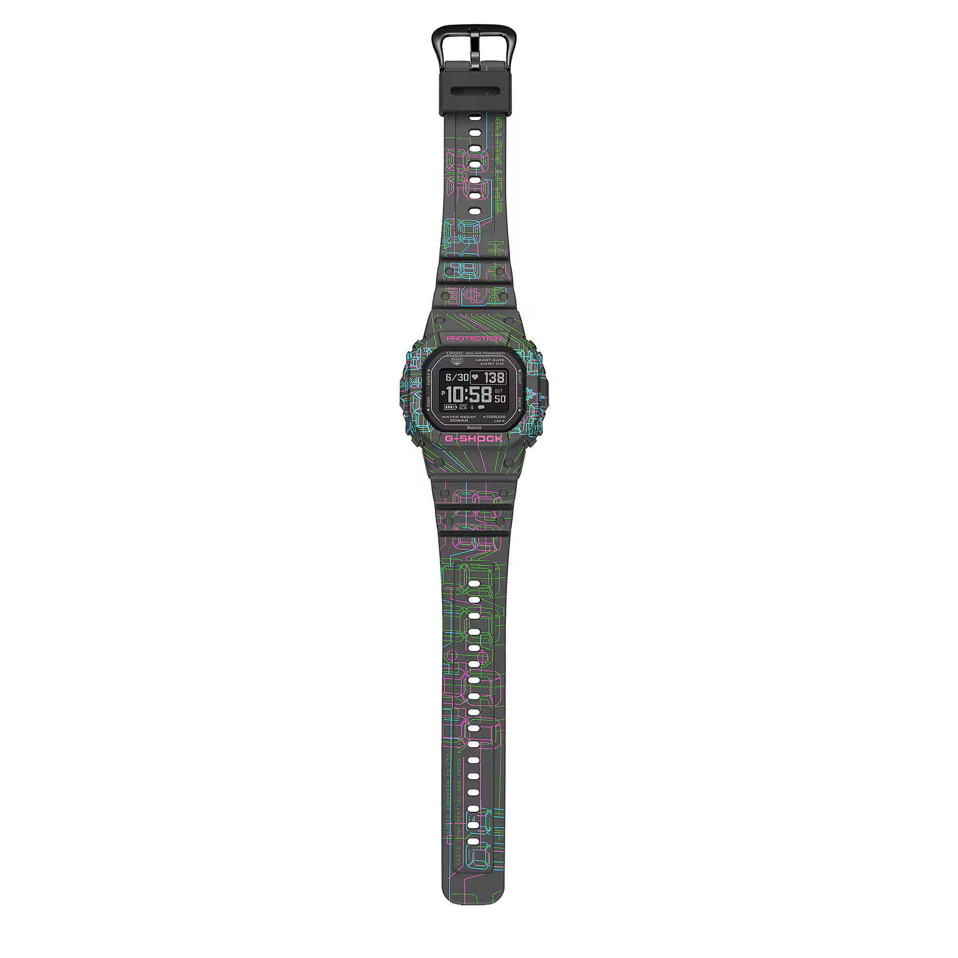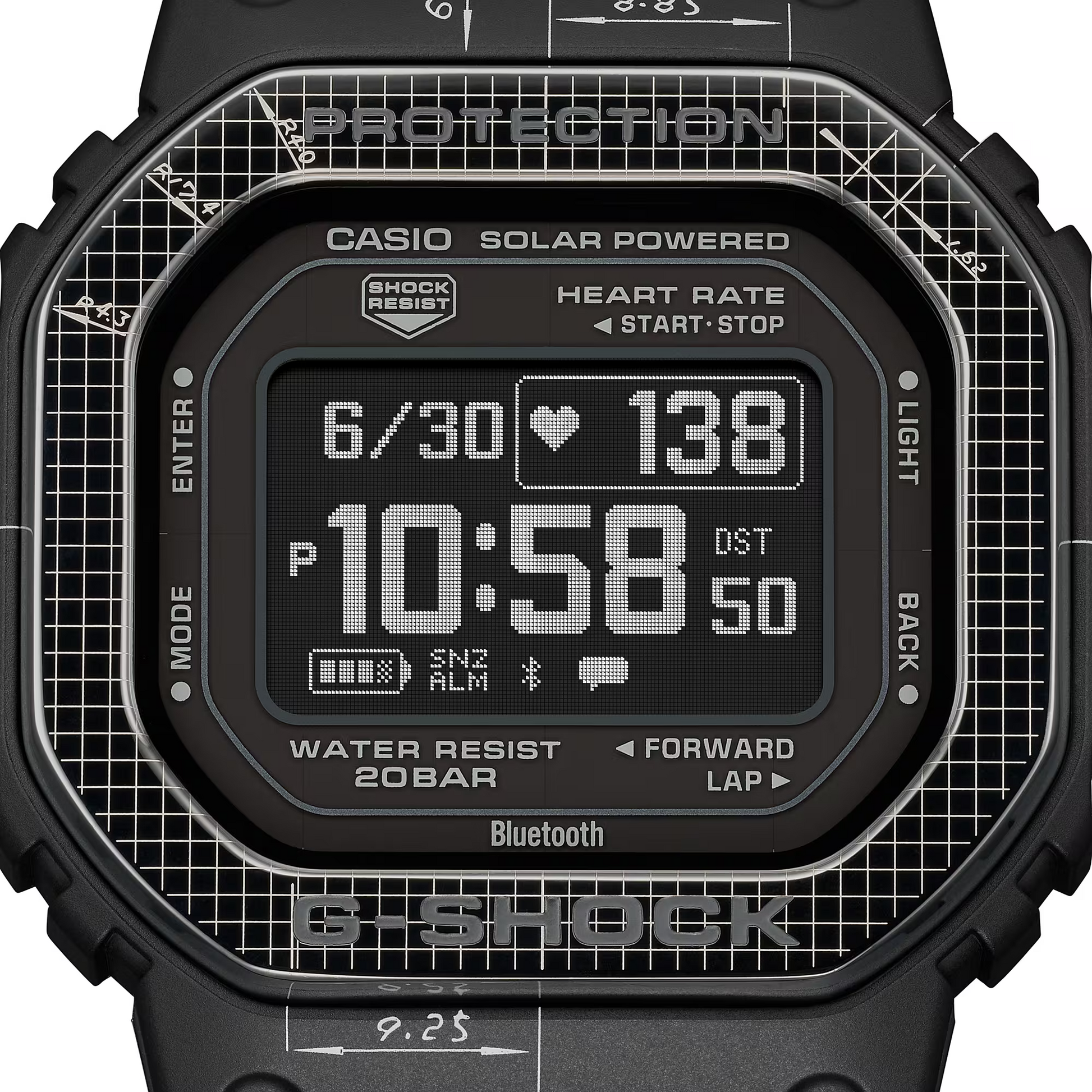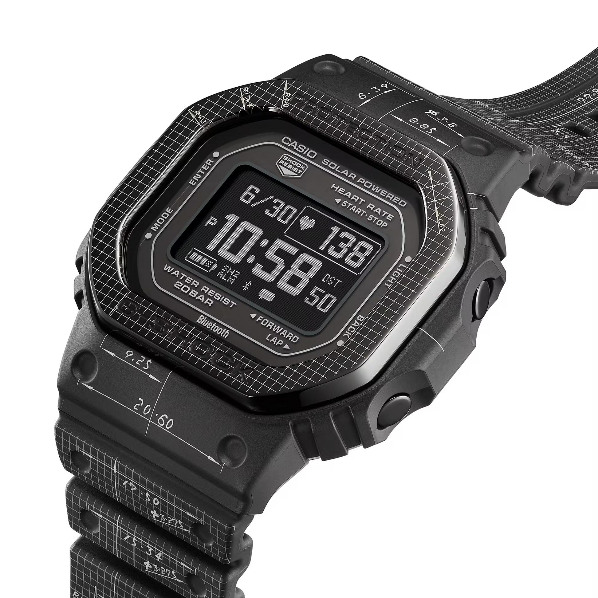 The Casio G-Shock DW-H5600EX-1DR is a robust digital watch designed for serious athletes. Featuring interchangeable bezels and bands inspired by the original DW-5000C’s technical drawings and circuit board layouts, it offers customizable style. Equipped with an optical heart rate sensor and accelerometer, it accurately tracks your workouts and steps. Integration with the Polar™ smartwatch library enables detailed workout analysis, post-sleep recovery monitoring, and breathing exercise support, making it a comprehensive tool for optimizing your training and performance.