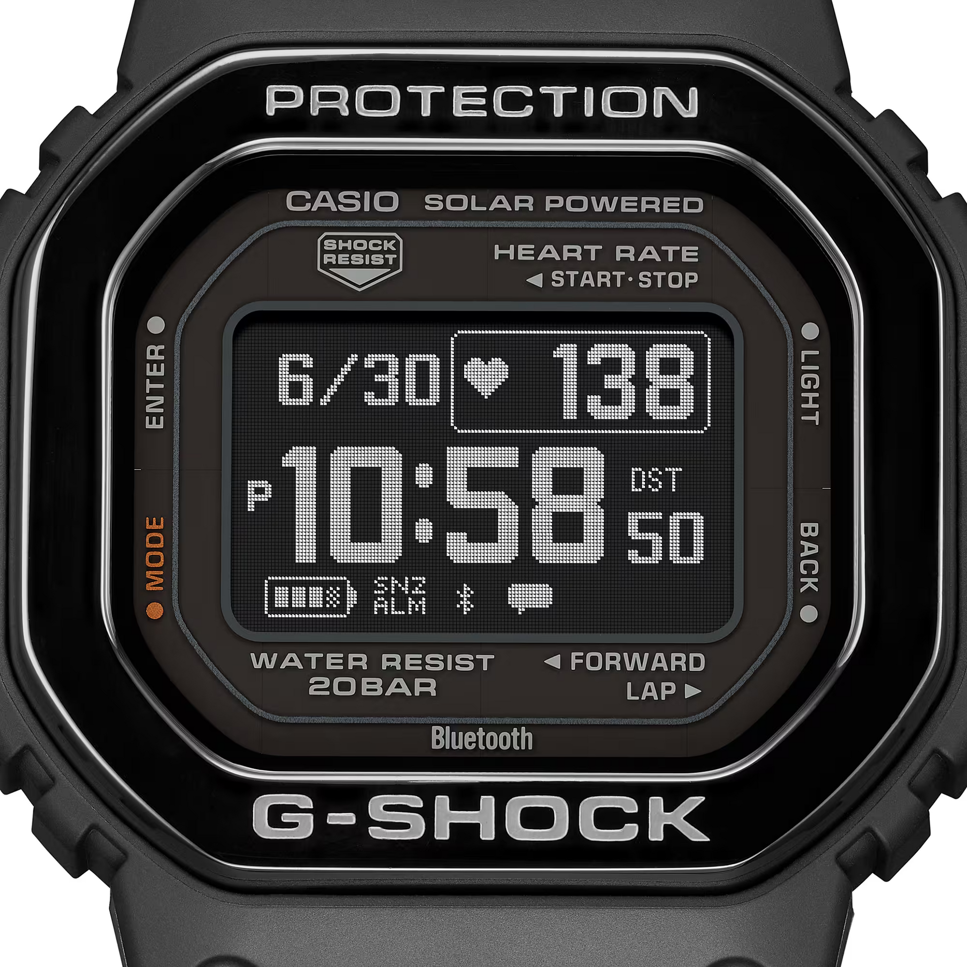 The Casio G-Shock DW-H5600MB-1DR combines rugged durability with advanced fitness tracking capabilities. Part of the sports-focused G-SQUAD line, this black digital watch features an optical heart rate sensor, step-counting accelerometer, and blood oxygen monitoring. Access the PolarTM smartwatch library for comprehensive workout analysis, recovery tracking, and breathing exercises. The high-definition Memory in Pixel LCD ensures exceptional visibility in any environment, making this watch an essential companion for running, walking, or gym sessions. Engineered with G-Shock's legendary toughness while supporting your health and fitness goals.