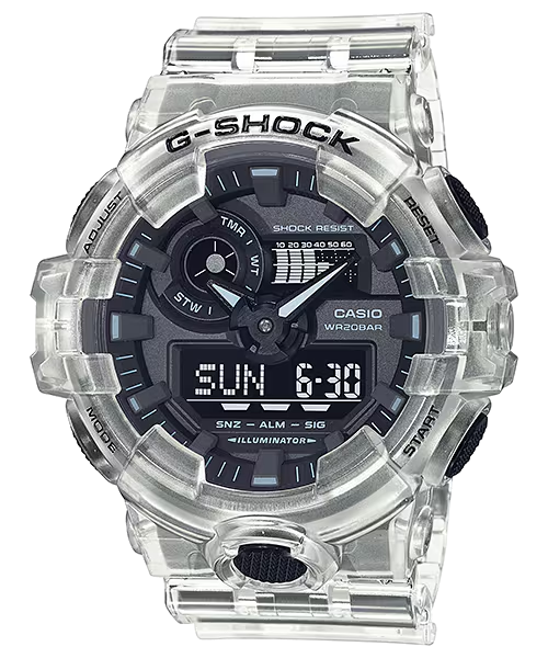 Discover the perfect blend of style and functionality with the Casio G-SHOCK GA-700SKE-7ADR Analog Digital Men's Watch. Embrace a stealthy and trendy look with its camouflage dial and translucent bezel. This monochromatic watch features world time, stopwatch, countdown timer, alarms, and a mute function for the active individual. Its unique hand shift feature and precise accuracy make it a must-have for any modern adventurer.