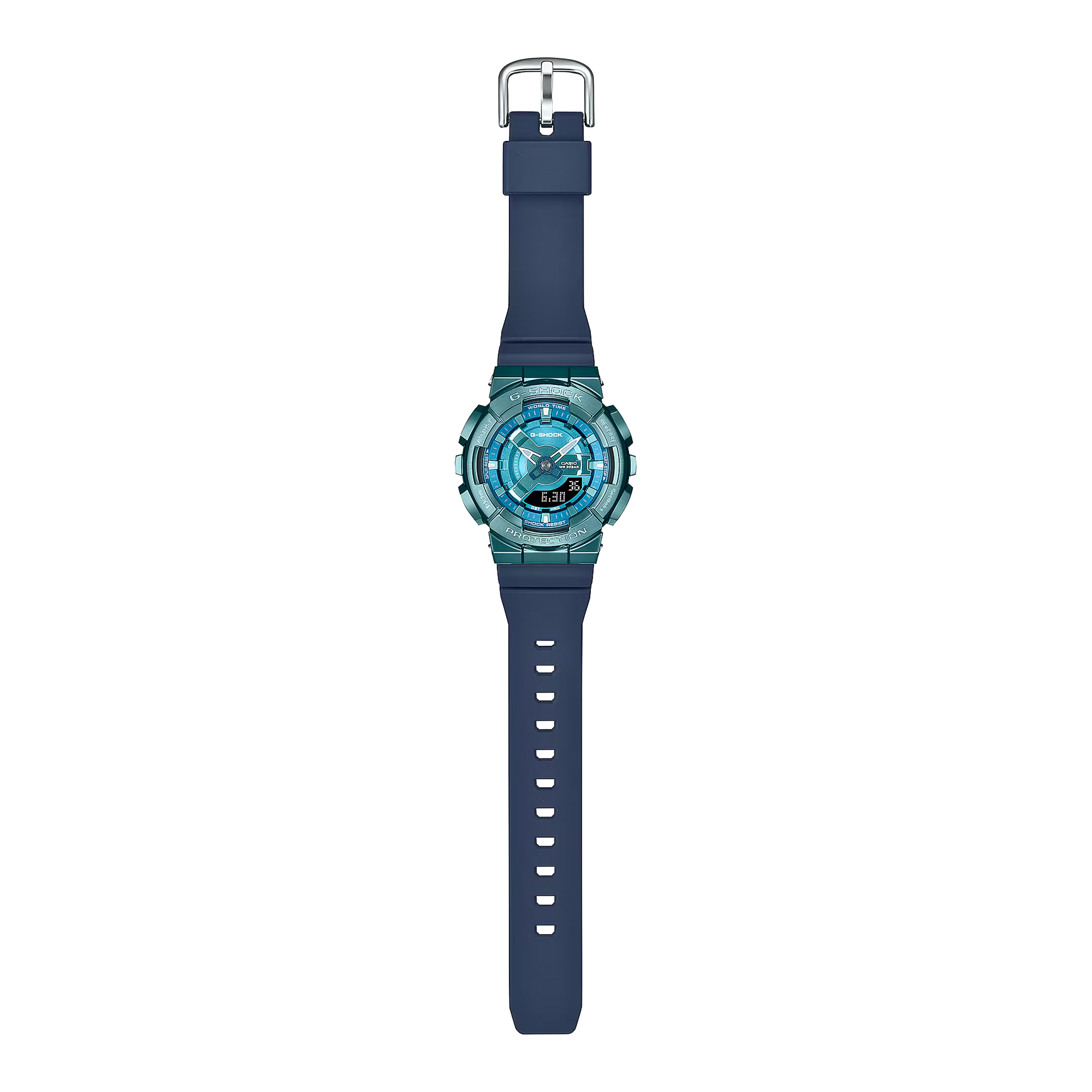 Casio's GM-S110LB-2ADR combines analog-digital functionality in a refined, slimmer G-SHOCK design specifically crafted for women. The multilayered 3D dial components create striking depth while maintaining exceptional readability. Featuring a stainless steel bezel cover with complementary metallic accents and a distinctive flat band, this timepiece delivers G-SHOCK's legendary durability with sophisticated styling. The perfect balance of technical performance and elegant aesthetics for the discerning wearer.