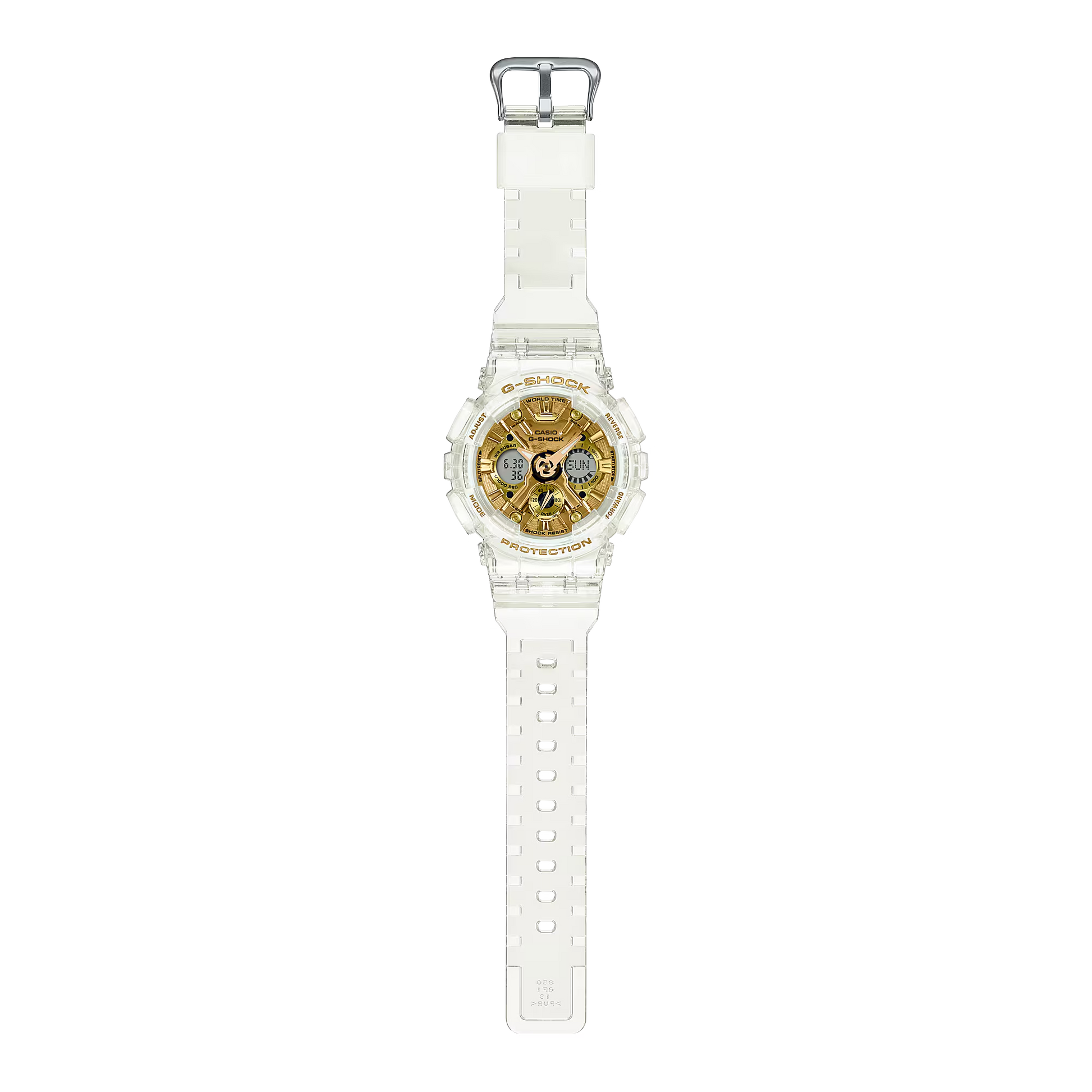 Elevate your style with the Casio G-Shock GMA-S120SG-7ADR, featuring a radiant gold-toned face achieved through metallic vapor deposition. Its translucent white band complements the gleaming dial, creating a sophisticated accessory that captures the essence of summer elegance. Combining analog and digital displays, this watch offers both functionality and fashion, perfect for those seeking a durable yet chic timepiece. Choose this model or explore the GMA-S110 or the classic octagonal GMD-S5600 to suit your personal style.