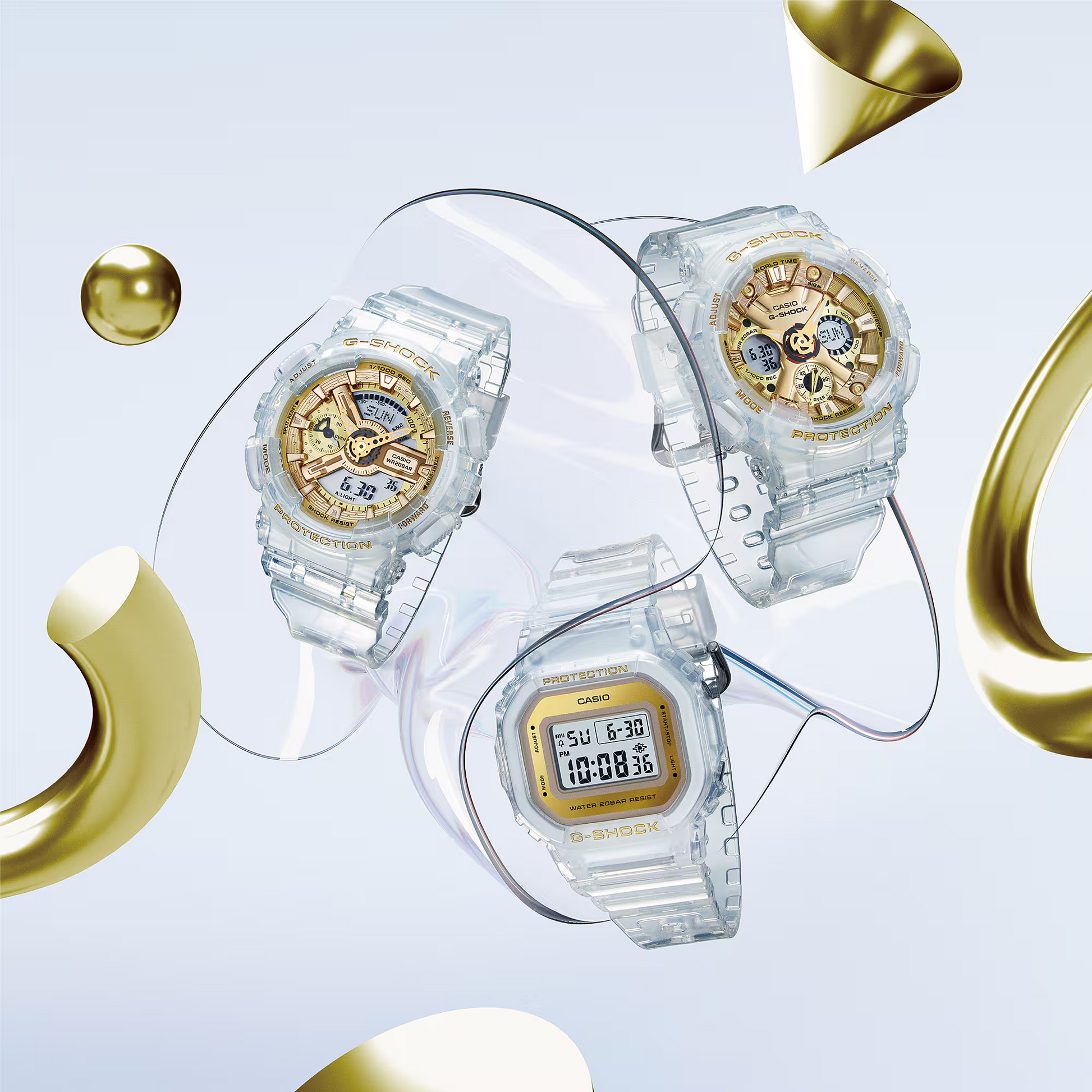 Elevate your style with the Casio G-Shock GMD-S5600SG-7DR, featuring a radiant gold-toned face achieved through metallic vapor deposition. Its translucent white band offers a modern, sleek contrast, making it a versatile accessory that combines durability with refined elegance. This digital watch delivers the trusted toughness of G-Shock in a compact, classic octagonal design, perfect for those seeking both function and fashionable flair.