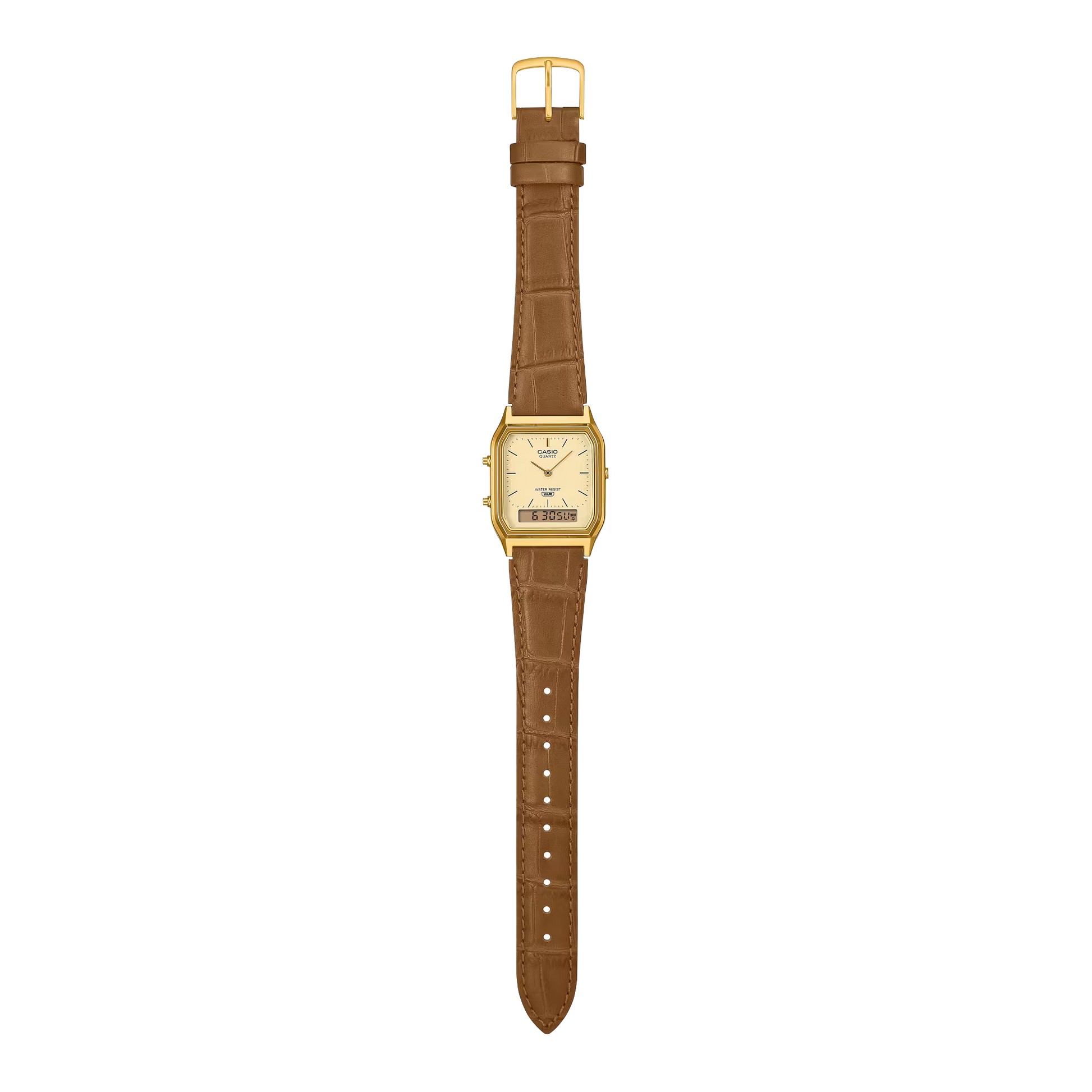 Indulge your love of vintage-inspired premium style with an analog-digital timepiece featuring a compact angular face. Based on the popular AQ-230, the watch delivers an elegant, refined look, as well as practical utility with water resistance for daily use, stopwatch, alarm, and other features. The classic embossed design of the band adds a timeless touch. Enjoy the sophistication that comes from thoughtful attention to small details, and the special charm offered by fresh color options.