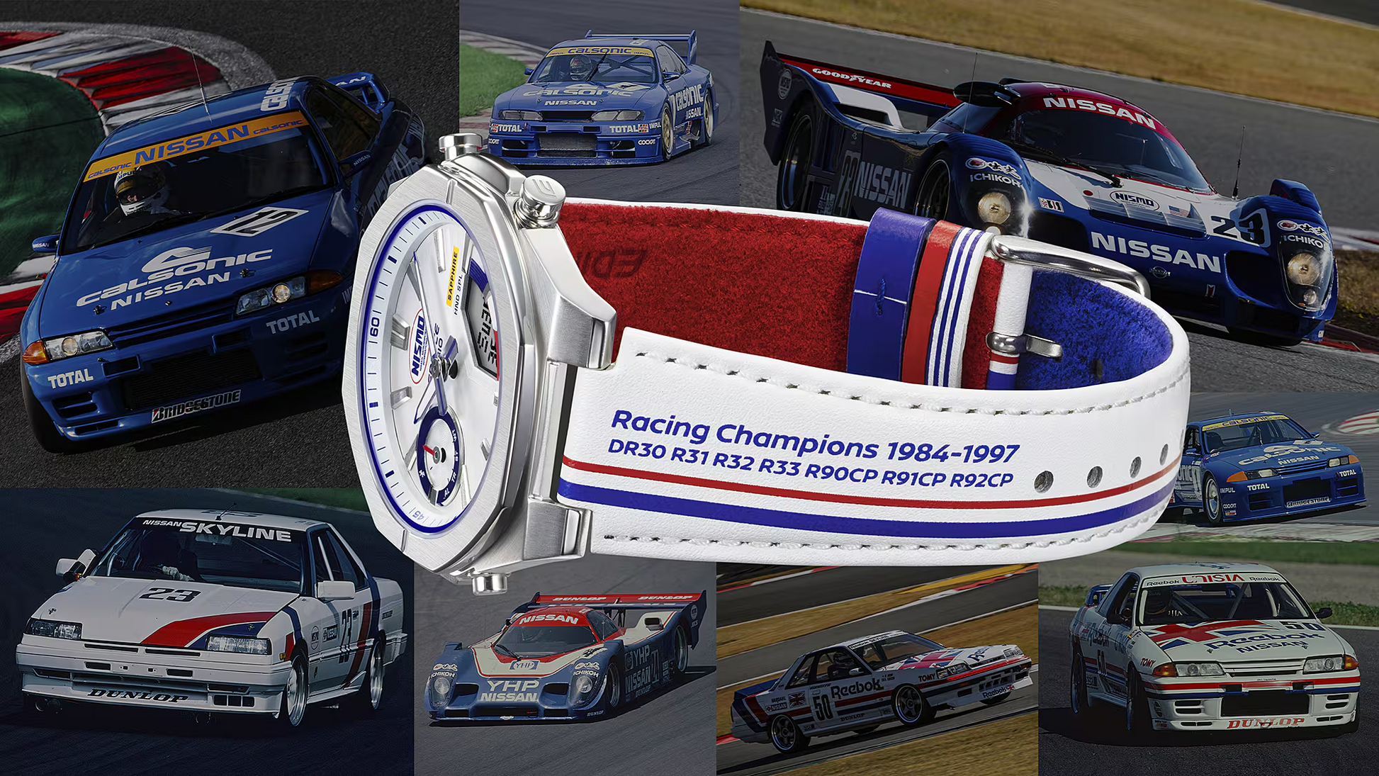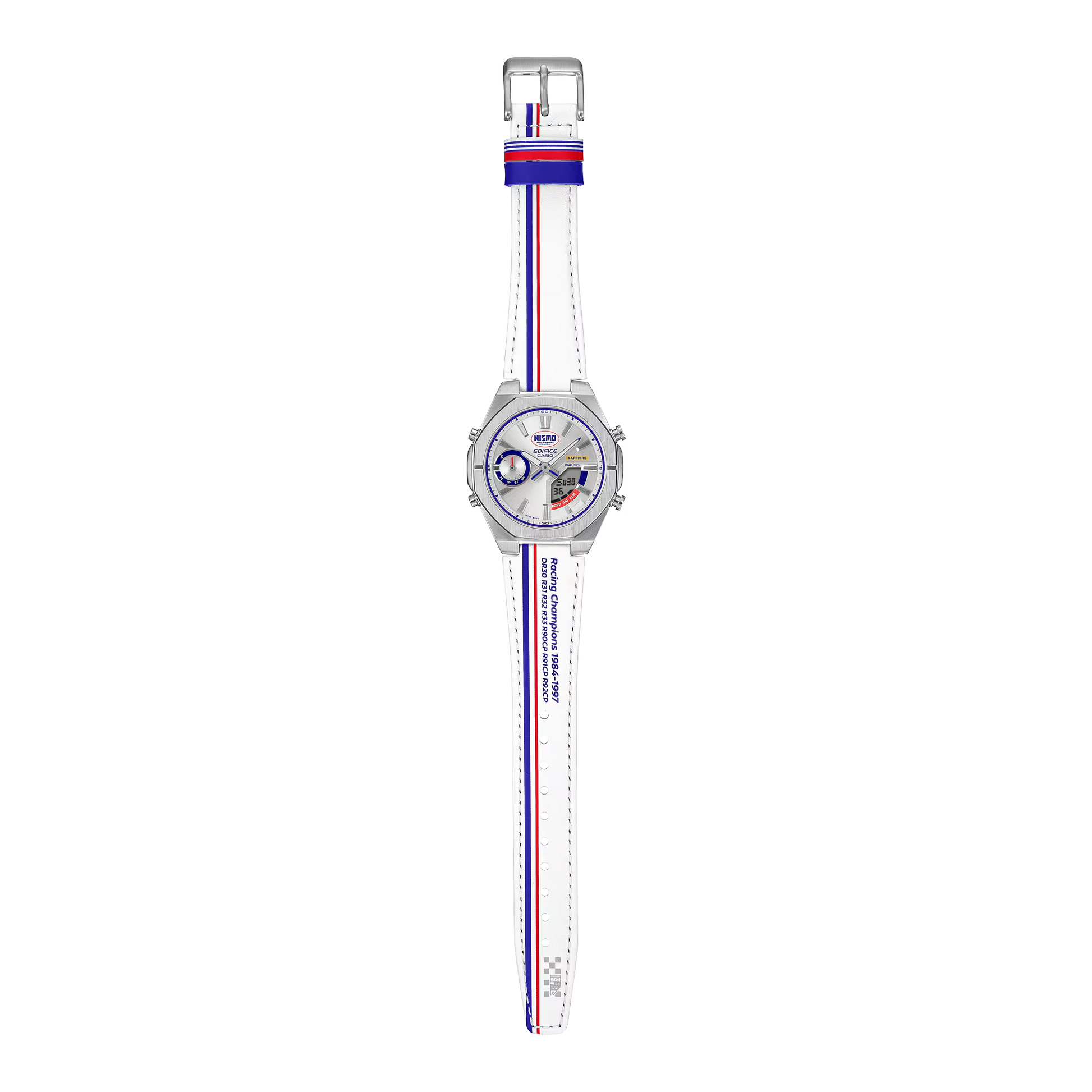 Celebrate your passion for speed with a very special EDIFICE collaboration — a tribute to NISMO heritage for your wrist. Born of a three-way collaboration between Casio, Nissan, and NISMO, this limited-edition timepiece honors all that NISMO, Nissan’s works team, has achieved since its founding in 1984. This sharp and striking timepiece incorporates eye-catching features like the original NISMO logo and a dial and band in the works team’s vivid tricolor design. The blue and red of the tricolor scheme is echoed on the underside of the band, and the stripes of the original NISMO uniform are reproduced on the band loop. The band is also printed with the names of NISMO champions between 1984 and 1997, paying tribute to both the celebrated race cars and the team that brought them to glory. The logo at the top center of the dial glows in the dark, reminiscent of the fluorescent car numbers used by the Group C race cars that would speed through the black of night during 24-hour endurance races. A unique wristwatch take on the orange windshield banner of the Nissan Skyline R32 adds a singular touch to the dial design. Meticulous details like these come together to honor NISMO race cars through and through. This special timepiece delivers when it comes to technology, too. It’s a snap to sync with your smartphone via Bluetooth®. Tap into the app to get automatically adjusted precision timekeeping and effortlessly manage watch operations on your phone — reliable functions that racing teams depend on when they need to make every second count. The thin, lightweight 9.6mm case delivers a comfortable fit, while sapphire crystal glass and 100-meter water resistance project quality sophistication. Indulge in the passion and glory of NISMO with the EDIFICE NISMO heritage collection.