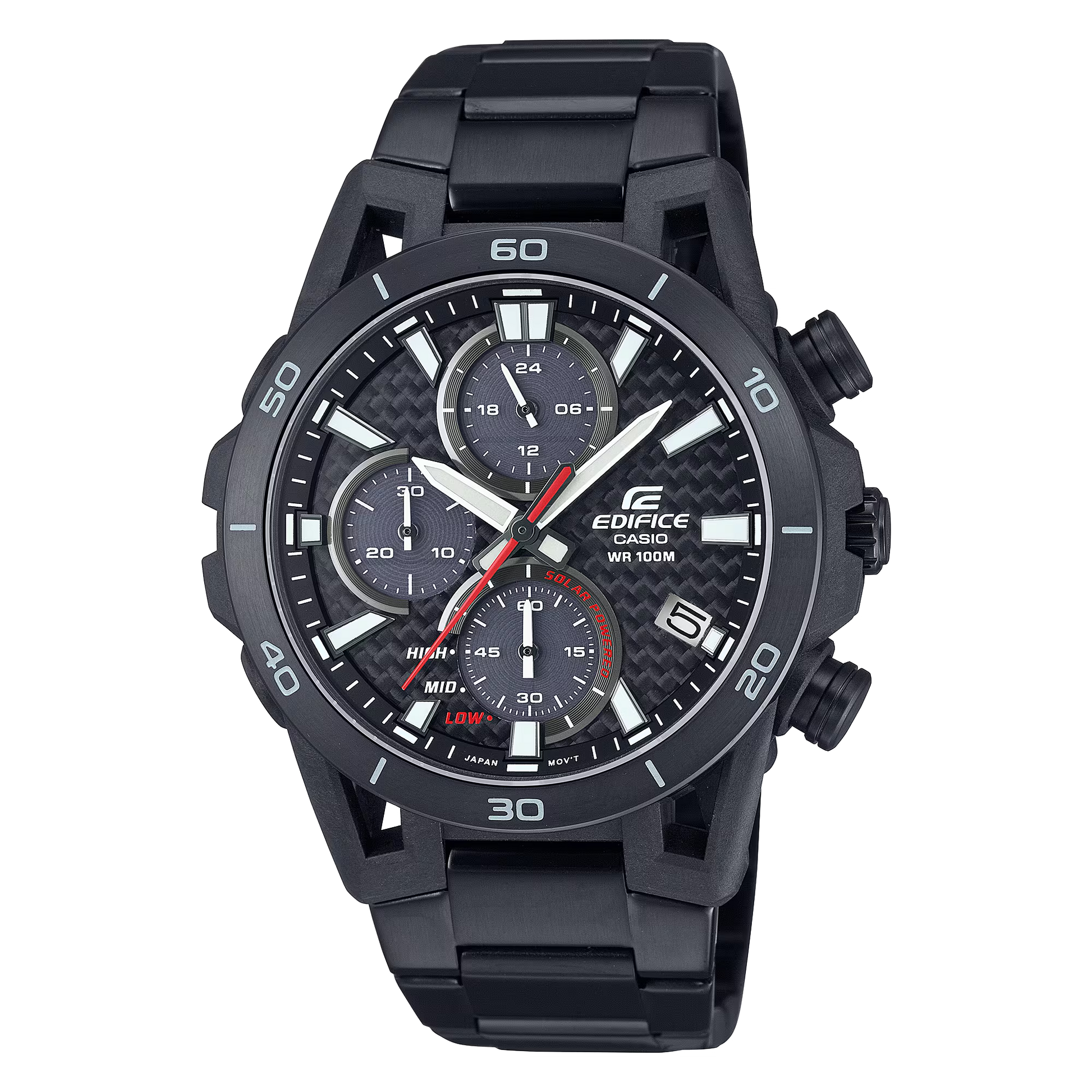 Elevate your style with the EDIFICE SOSPENSIONE CHRONOGRAPH MEN WATCH EQS-960DC-1AVUDF. Its lightweight and durable carbon fiber-reinforced resin case, inspired by high-performance motorsports, features a unique suspension arm design and lug design. Solar panels harness light through inset dials, powering this watch for up to 5 months when fully charged.