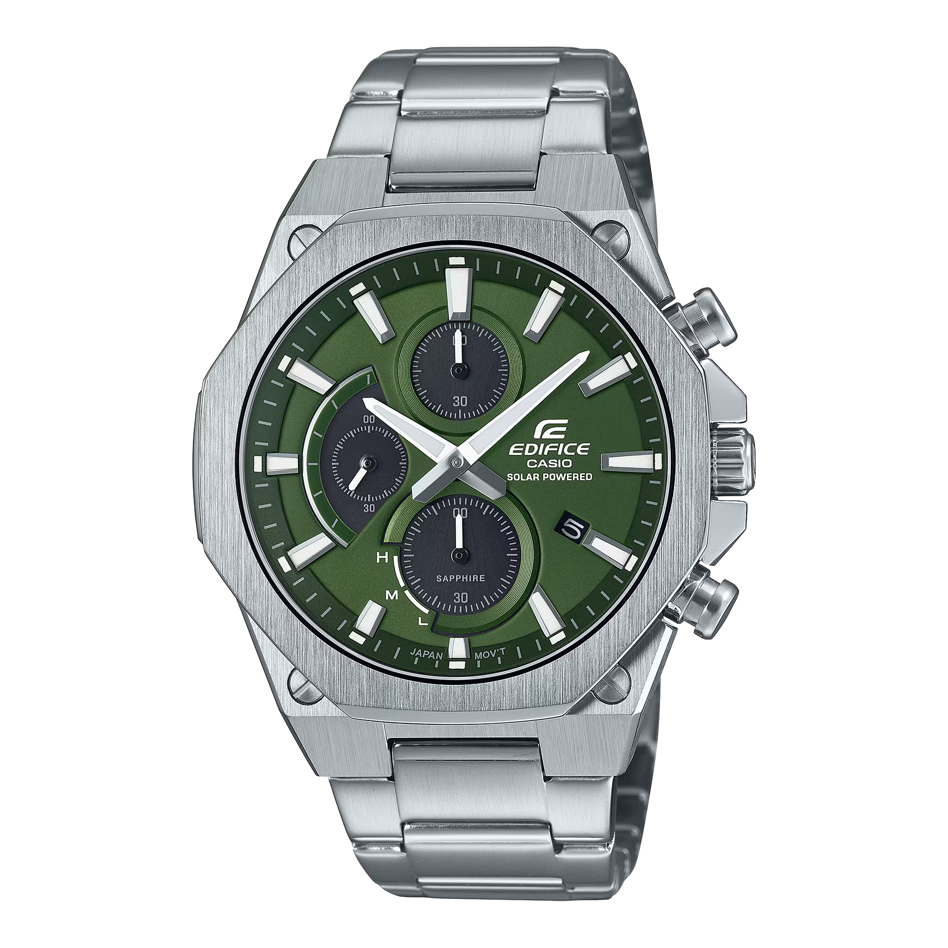 This EDIFICE STANDARD CHRONOGRAPH WATCH EFS-S570D-3AUDF is slim and solar powered, perfect for those on the go. With a case thickness of only 9.7mm, it offers a comfortable and sleek fit. The flat octagonal bezel with a hairline finish gives it a touch of sportiness and luxury. Plus, its scratch-resistant sapphire crystal ensures durability and longevity.