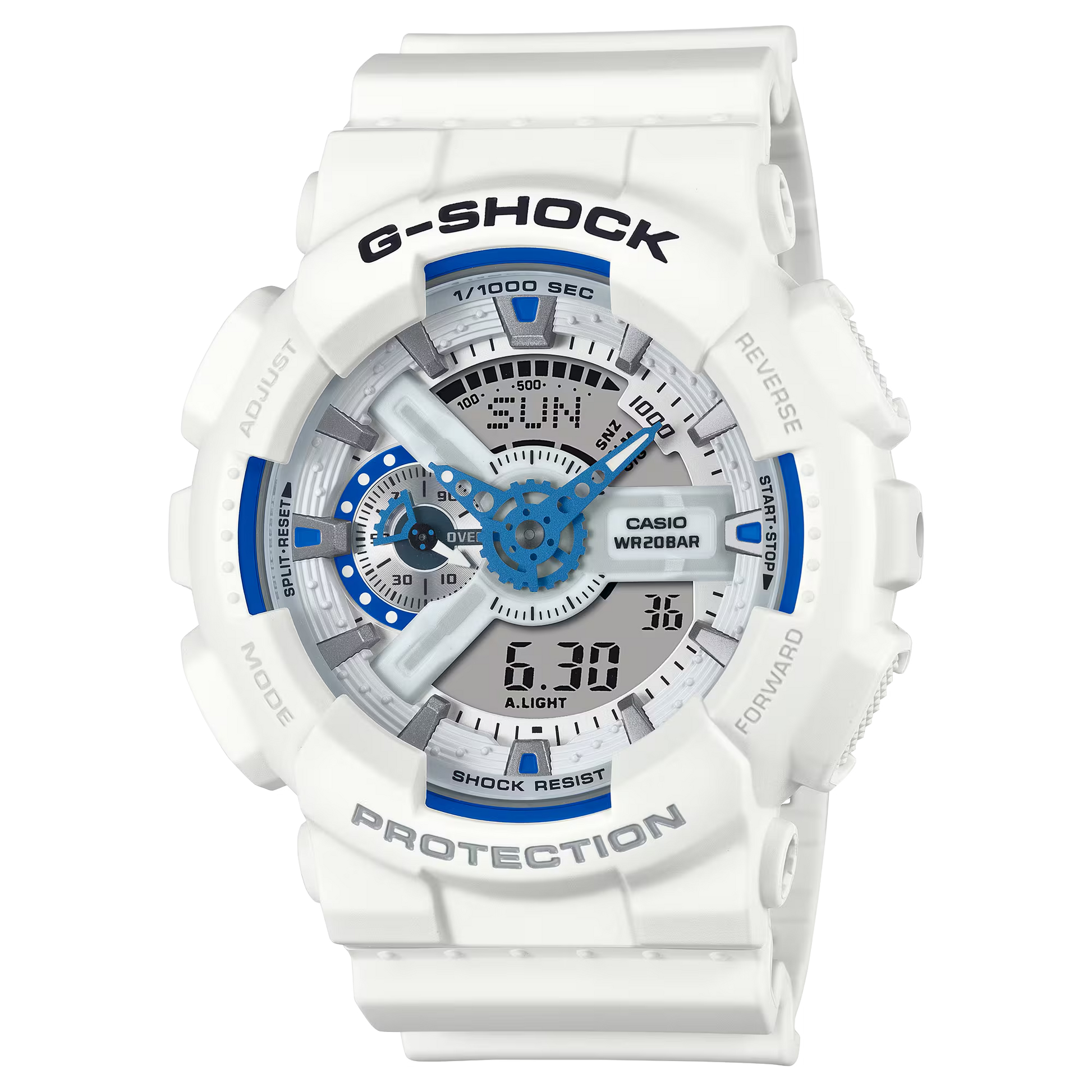 Inspired by the summer seas, the G-SHOCK CASUAL MEN WATCH GA-110HDS-7ADR features a striking white and blue design that transitions seamlessly from day to night. Its blue phosphorescent face emits a captivating glow in the dark, reminiscent of bioluminescent plankton. This watch combines durability with a refined aesthetic, making it suitable for both casual outings and professional environments. Experience the perfect blend of style and functionality inspired by the ocean’s ever-changing beauty.
