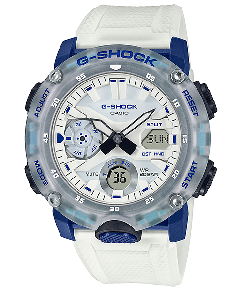 The G-SHOCK CASUAL MEN'S WATCH GA-2000HC-7ADR combines durability with distinctive design inspired by a hidden coastline theme. Its translucent resin band and bezel reveal the intricate internal components, offering a unique aesthetic that suits sporty, refined, or rugged looks. Crafted entirely from resilient resin, this watch delivers reliable strength and style for everyday wear in any environment.