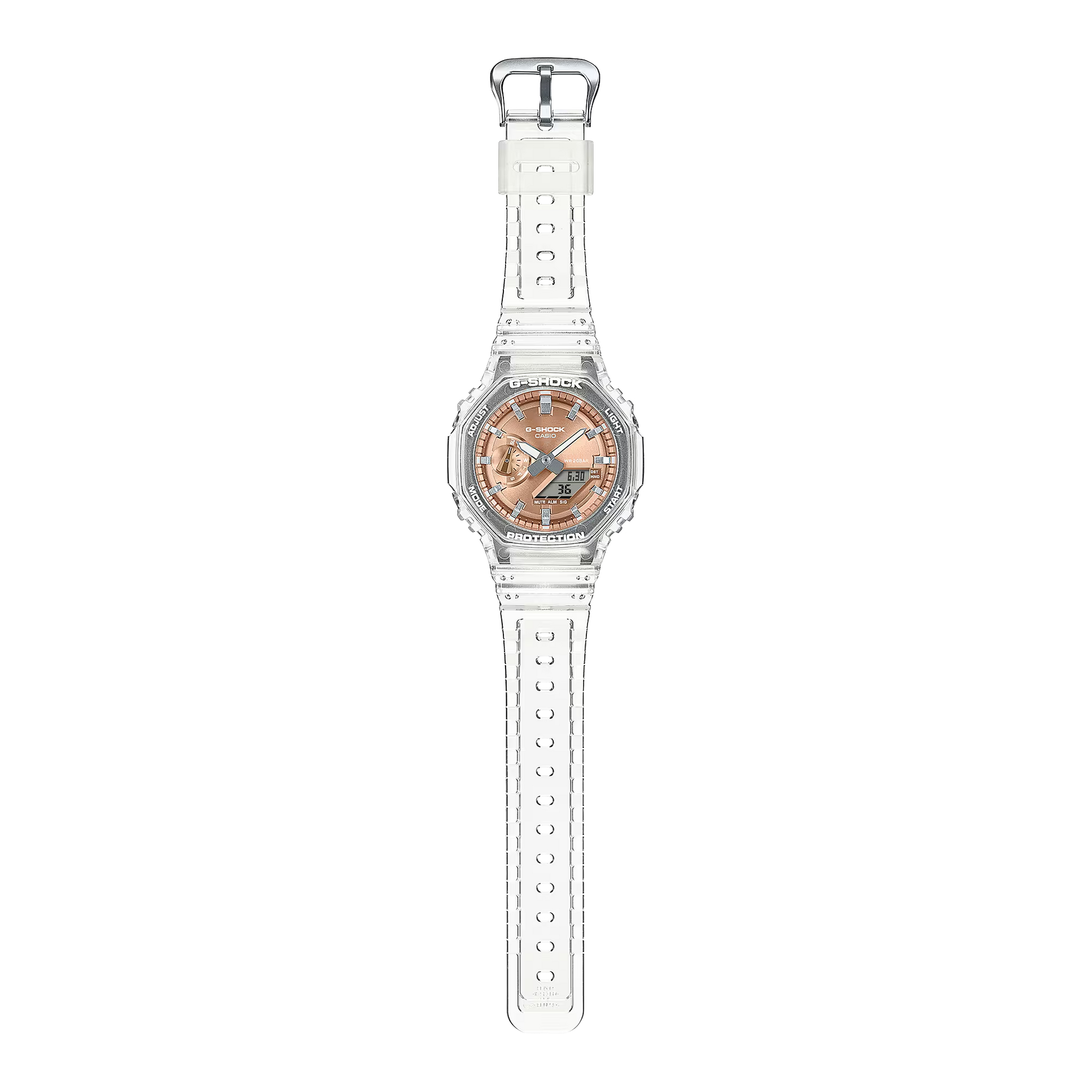 Introducing the G-SHOCK CASUAL MEN WATCH GA-2100BM-7A5DR. With its shimmering color and cool translucence, this watch combines function with fashion. The octagonal bezel and metallic vapor deposition dial in rose gold give it a confidently cool look. Add a pop of color to your style with the translucent band.
