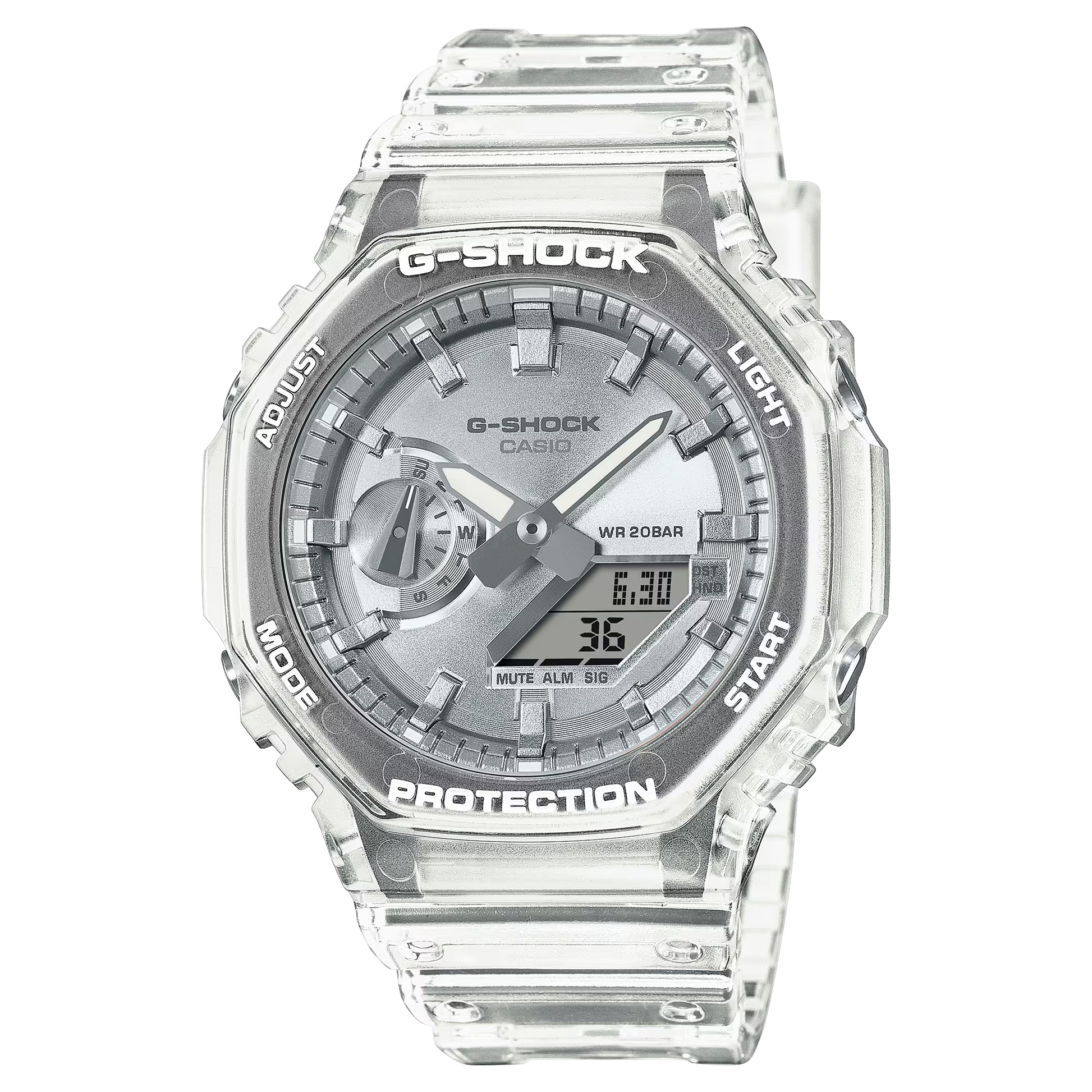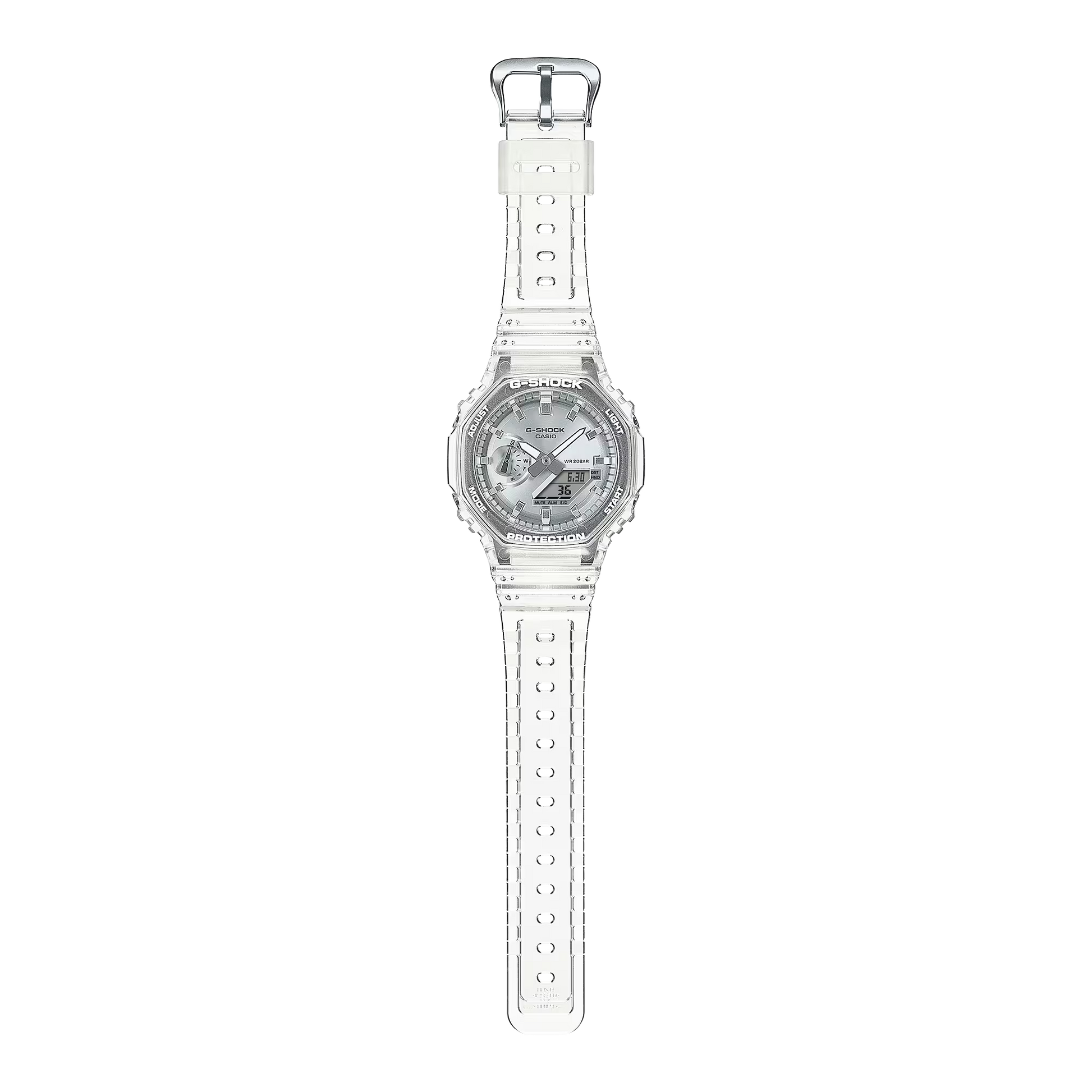 The G-SHOCK CASUAL MEN WATCH GA-2100BM-7A8DR features a shimmering, translucent design with an octagonal bezel and metallic vapor deposition dial in silver. Perfect for a confidently cool look, these watches add a stylish touch to any street-savvy fashion.