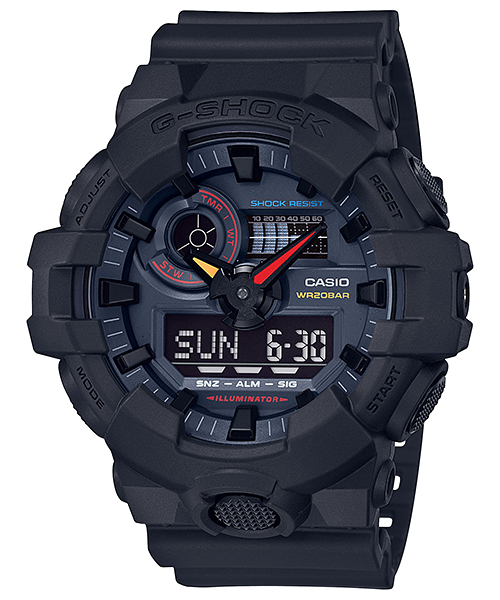 Introducing the G-SHOCK CASUAL MEN WATCH GA-700BMC-1ADR, the ultimate timekeeping tough watch since 1983. This model combines basic jet black with vibrant neon light-like colors for a fashionable and striking look. Perfect for the modern man who values both style and durability.