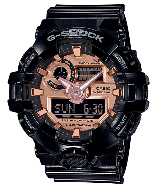The G-SHOCK GA-700MMC-1ADR is the ultimate watch for street fashion enthusiasts and active individuals. With its sleek black finish and rose gold accents, it incorporates iconic design elements into its powerful base model. Features include a stopwatch with target time alarm, hand shift feature, and super illuminator.