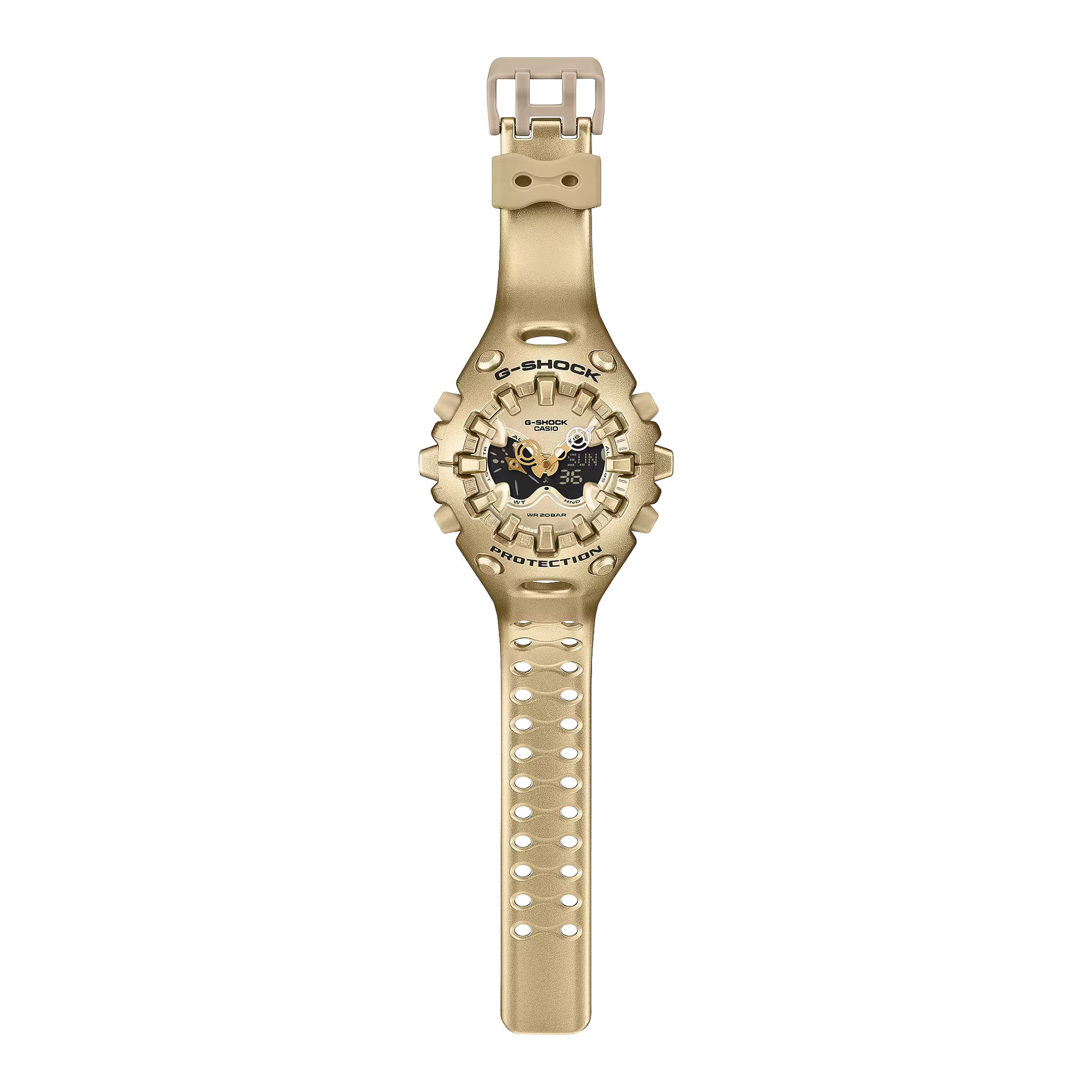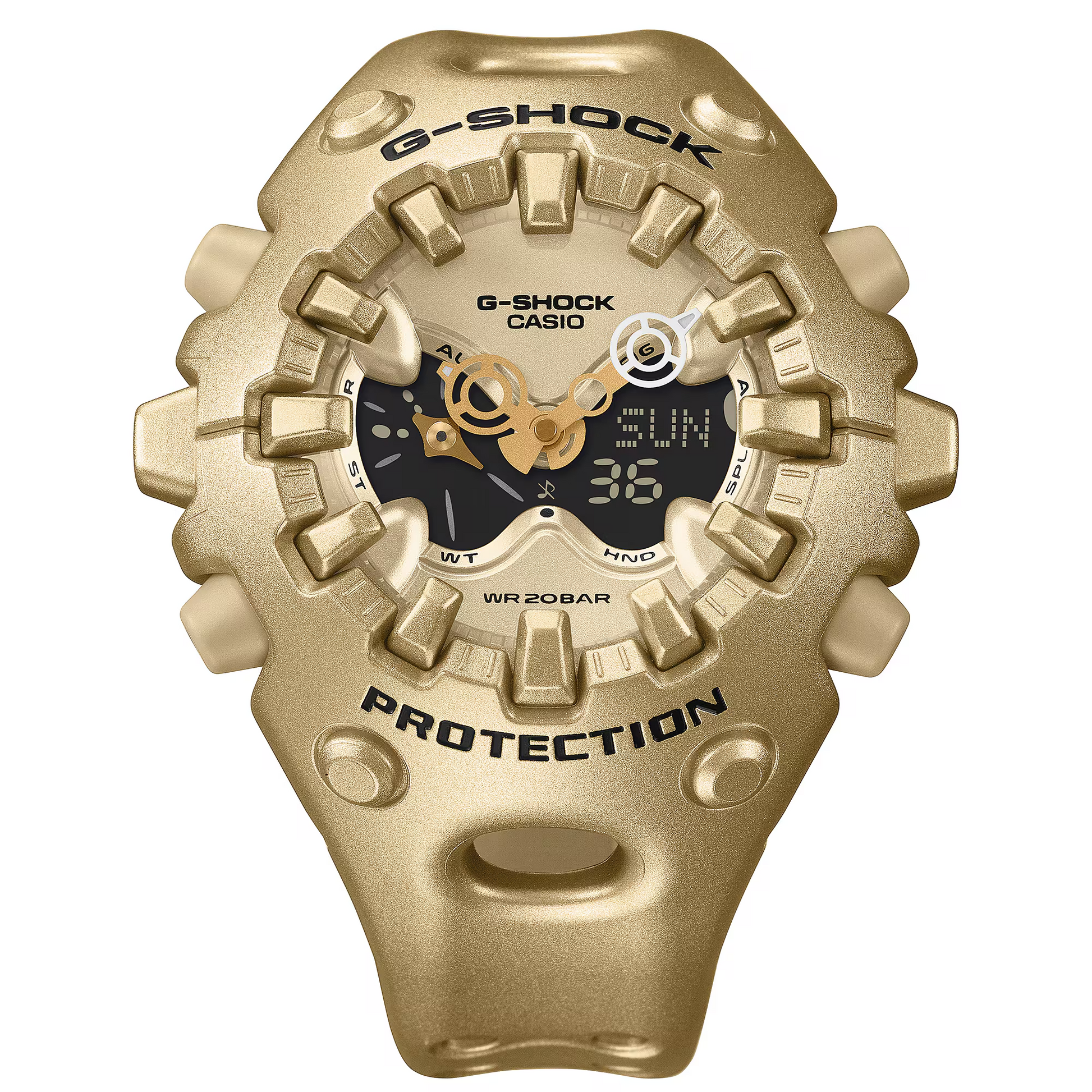 Indulge your love of G-SHOCK toughness and your appreciation of distinctive design — Check out a whole new reinterpretation of construction and design in an organic, edgy form. The GA-V01 brings together organic exterior form and sharp-edged components, combining these with a large, full-screen LCD, the newly developed Shock Release Hand and other innovative ideas reflecting the G-SHOCK identity of toughness. The center case protecting the module is covered by an exterior that employs an integrated bezel and band construction, with large dimensional indexes that overlap the glass to also function as shock-absorbent bumpers. This uniquely powerful design delivers a whole new look, while maintaining the characteristic G-SHOCK shock-resistance you love. To achieve this, we have developed a new magnetic holding structure, an innovative design where the hands, which are particularly vulnerable to impact, are attached using magnetic force rather than being fixed directly to the shaft. Allowing the Shock Release Hand (minute hand)* to absorb and dissipate impacts effectively, this new magnetic technology also makes it possible to create larger hands and offers more flexibility in styling. The layered construction of the analog-digital combination face incorporates a full-screen LCD and metallic dial featuring openwork to create decorative see-through sections. Specially designed oversized hour and minute hands in the center and an indicator hand within the LCD add the finishing touches to this strikingly original design. More than just a bold new look, these timepieces deliver on function, too. Offering 10-year battery life thanks to the high-capacity battery and low power consumption, they also feature an alarm function, LED light, and more. Choose your favorite from three new color options: a pop-inspired white, a vibrant and colorful pink, and a gold with an impressive matte finish.