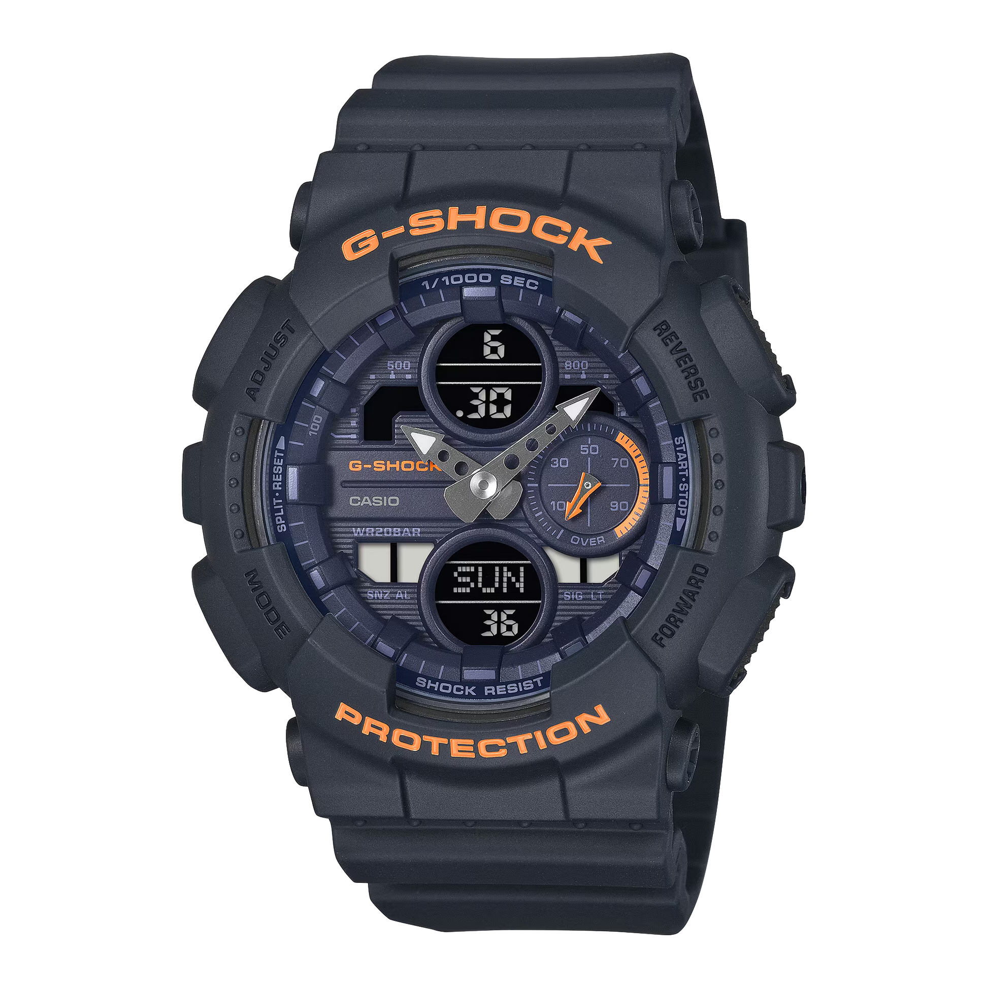 Brighten your day with an easy-to-wear navy G-SHOCK with touches of warm matte orange. The gray tone of the mode and feature indicators and overall matte finish presents a subtle, clean, effortlessly confident look. Meticulously designed down to the smallest details, these timepieces complement any style — the ideal accessory to bring a subtle touch of color to everyday casual outfits. Key components for the bezel and band are made with bio-based resin. Produced using renewable organic resources, this material is expected to help reduce environmental impact.