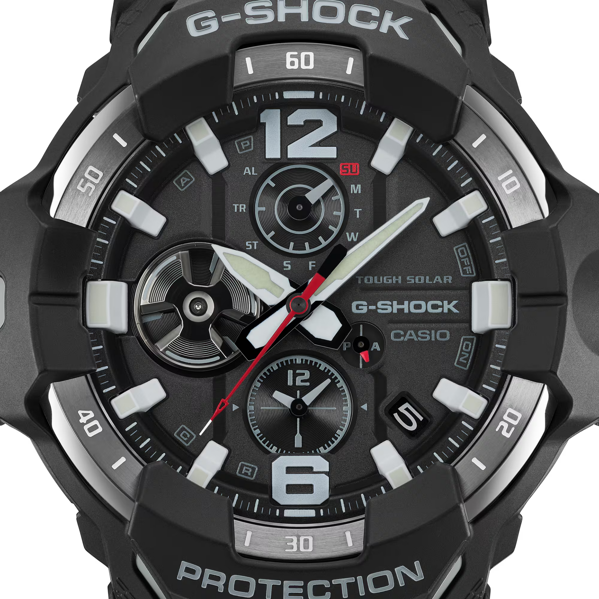 Become an expert in durability and fashion with the G-SHOCK MASTER OF G GRAVITY MASTER GR-B300-1ADR. This watch, inspired by aviation, is built to withstand the toughest conditions thanks to its Carbon Core Guard structure. With impressive shock-resistance, rigidity, and corrosion-resistance, the carbon fiber-reinforced resin case and seamless bezel create a commanding and formidable appearance.