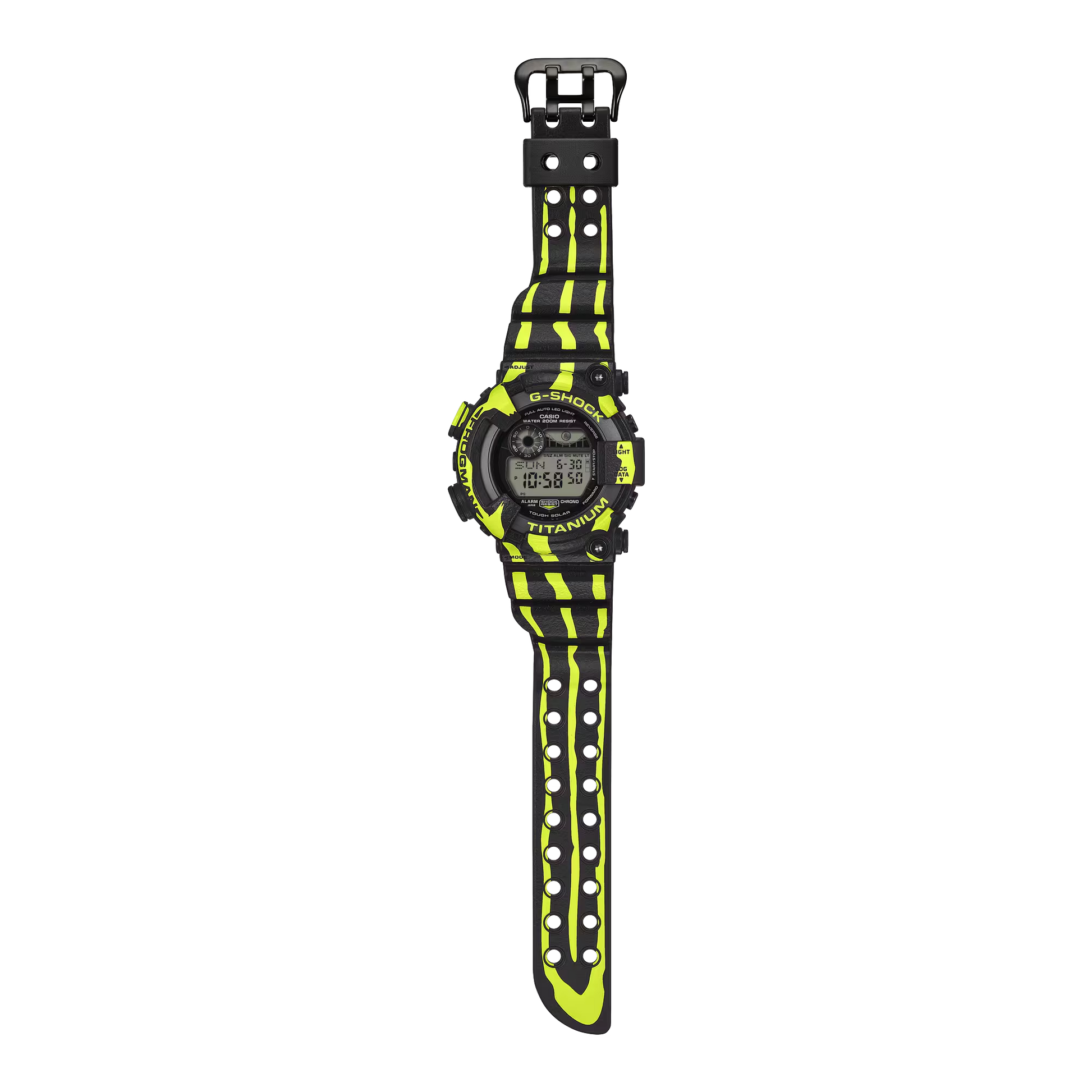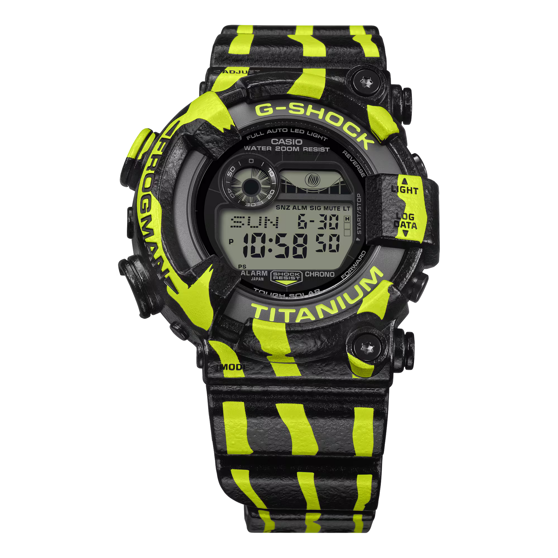 The G-SHOCK Master Of G Sea Frogman Digital Watch GW-8200TPF-1DR channels the raw power of the three-striped poison dart frog with uncompromising design. Fluorescent green vertical stripes slash across a black dial, mirroring the amphibian's bold warning coloration and commanding presence in South American rainforests. The band and bezel feature a specialized spray coating that replicates the frog's textured skin, while the engraved case back displays the signature diving frog emblem. Powered by Tough Solar technology, this timepiece eliminates battery maintenance concerns, delivering reliable performance in any condition. Built for those who demand both visual impact and functional excellence.