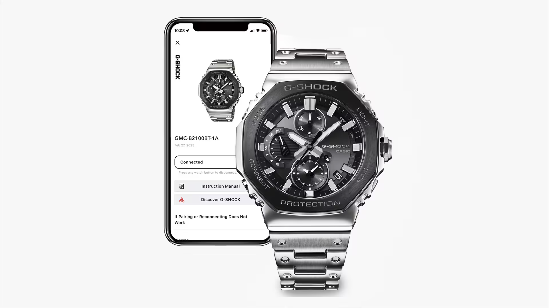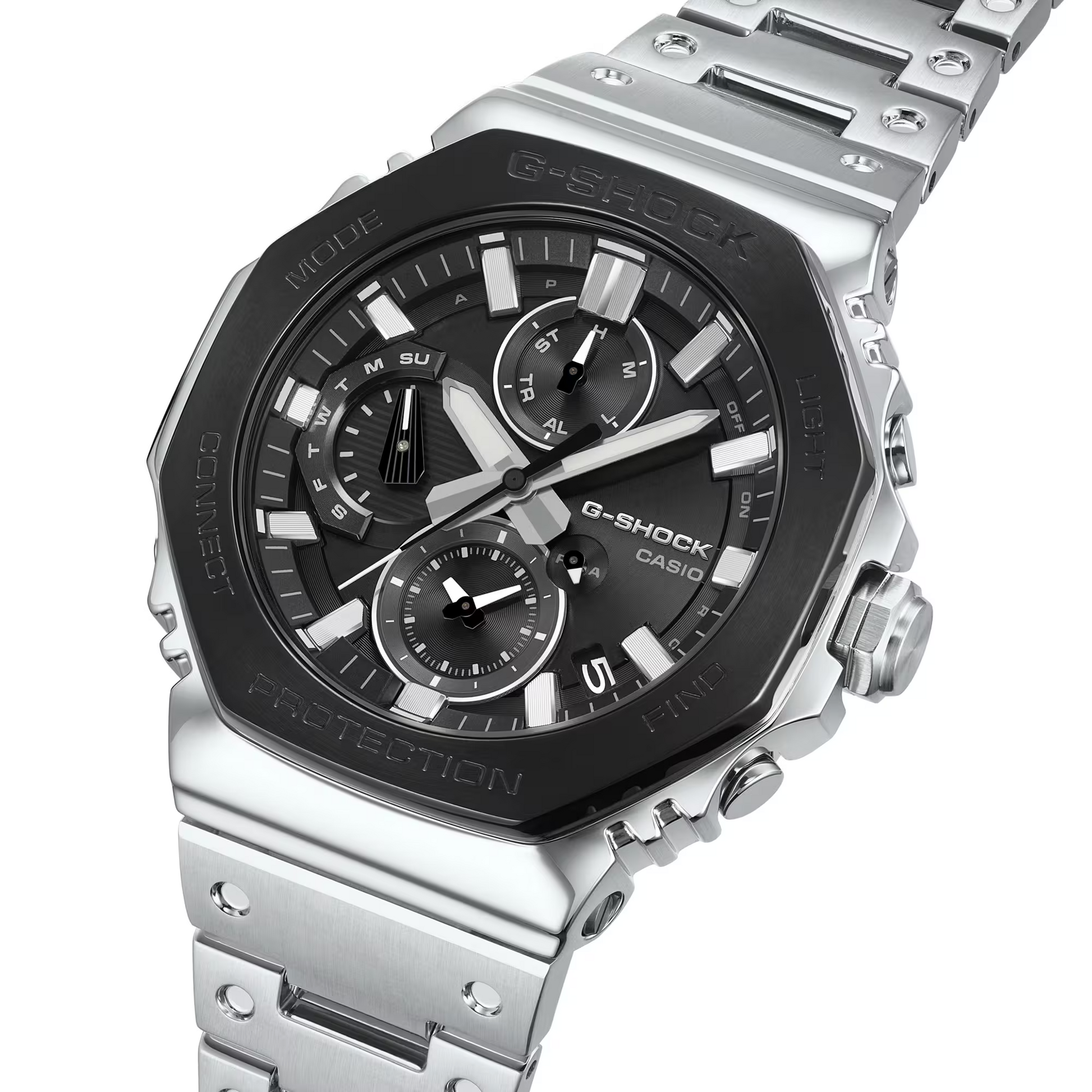 The GMC-B2100BT represents a bold evolution of G-SHOCK heritage, merging full-metal construction with the brand's legendary durability. This striking timepiece features a two-tone black-and-silver design that commands attention while maintaining understated sophistication. The stainless-steel bezel undergoes precision forging, cutting, and polishing to deliver exceptional depth and dimension, while the hairline finish on the top bezel conveys premium craftsmanship. Silver-vapor-deposited indexes enhance readability and create striking contrast against the dial. Built to withstand extreme conditions, the GMC-B2100BT preserves G-SHOCK's iconic shock-resistant engineering in a refined metal package that balances toughness with refined aesthetics.