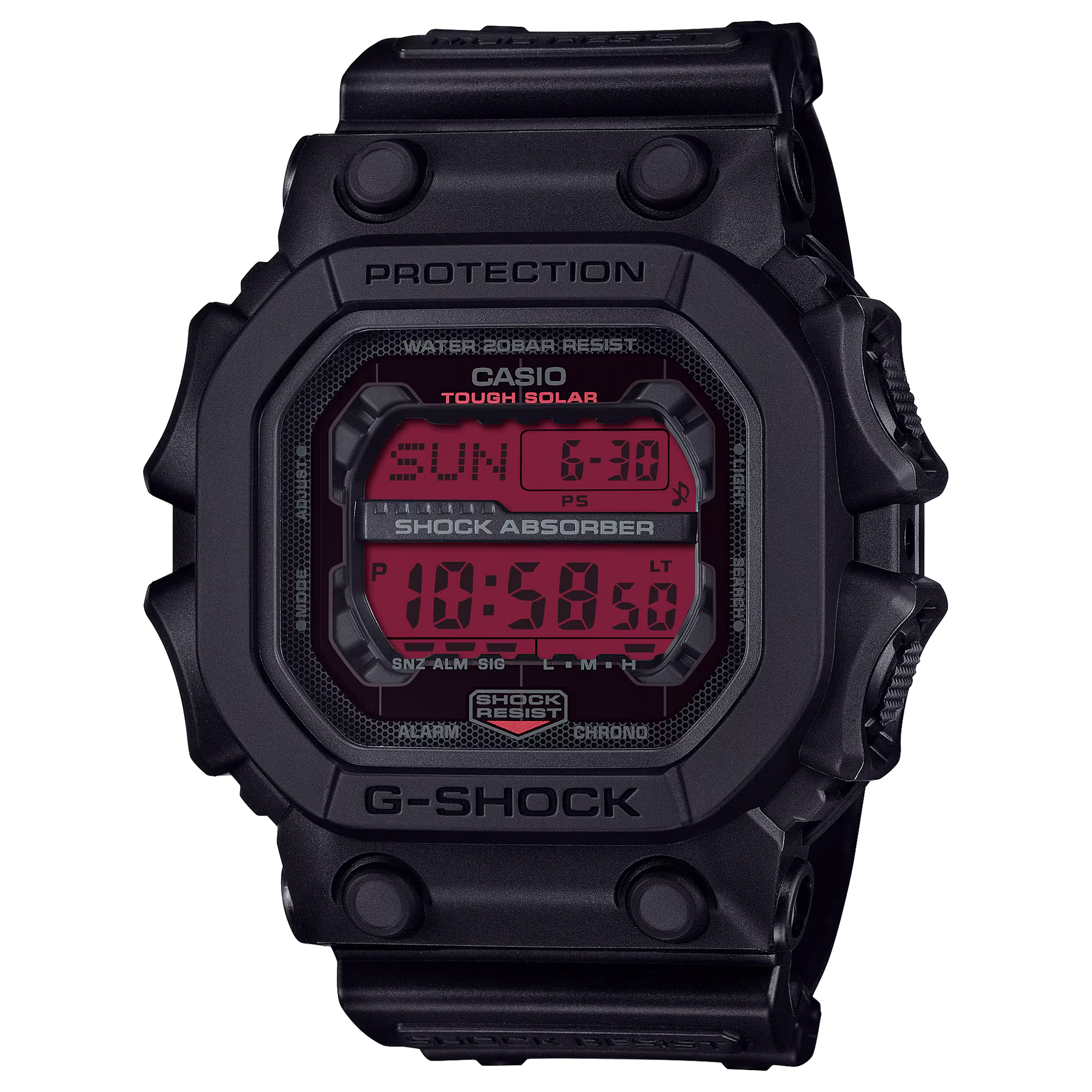 The G-SHOCK MEN WATCH GX-56BBR-1DR delivers unmatched toughness with a bold black design accented by a vibrant, high-saturation red LCD. This striking contrast not only elevates visibility but also redefines daring style. The backlight feature ensures the digital display remains clear in low-light conditions, making it as functional as it is fierce. Perfect for those who want to make a powerful statement, this watch blends resilience with intense, eye-catching aesthetics.