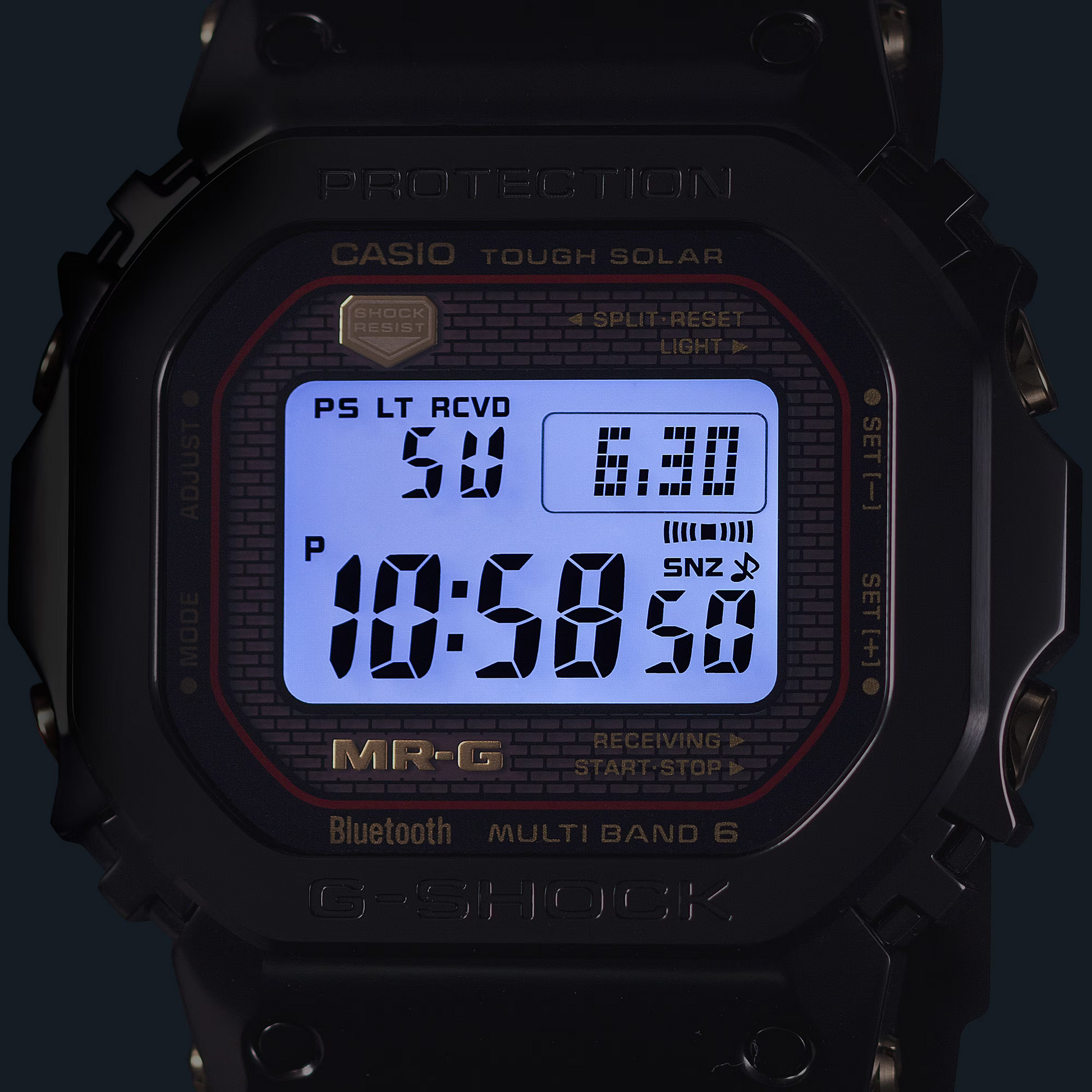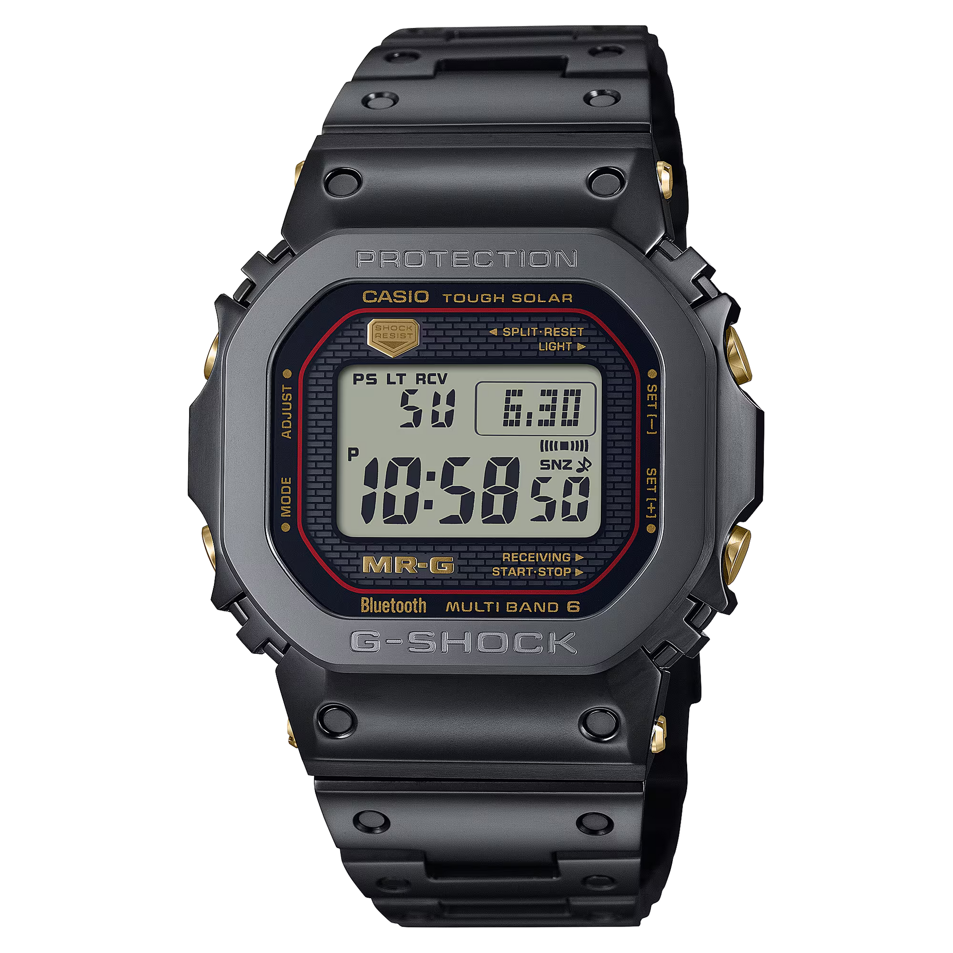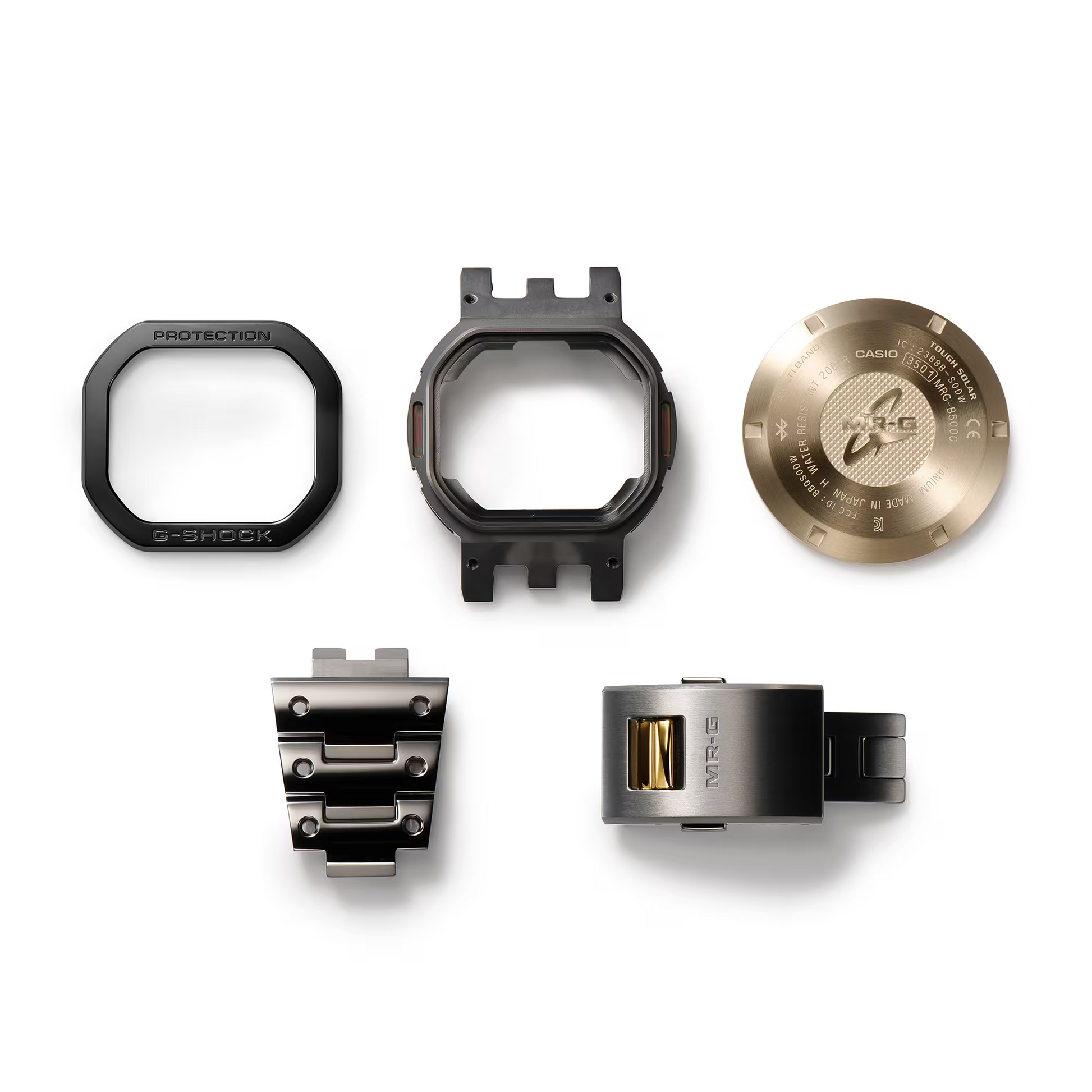 The G-SHOCK Premium Men Digital Watch MRG-B5000B-1DR exemplifies advanced metal craftsmanship, featuring a Ti64-based super-hard titanium alloy case and bezel. Its band is crafted from DAT55G titanium alloy, offering exceptional hardness and workability. The bezel’s top is made of COBARION®, a cobalt-chrome alloy four times harder than pure titanium, composed of 25 individually polished components for intricate detail. Equipped with a Multi-guard Structure using flat springs and silicone buffers, this timepiece delivers superior durability and precision, honoring the legacy of the original G-SHOCK with cutting-edge materials and design.