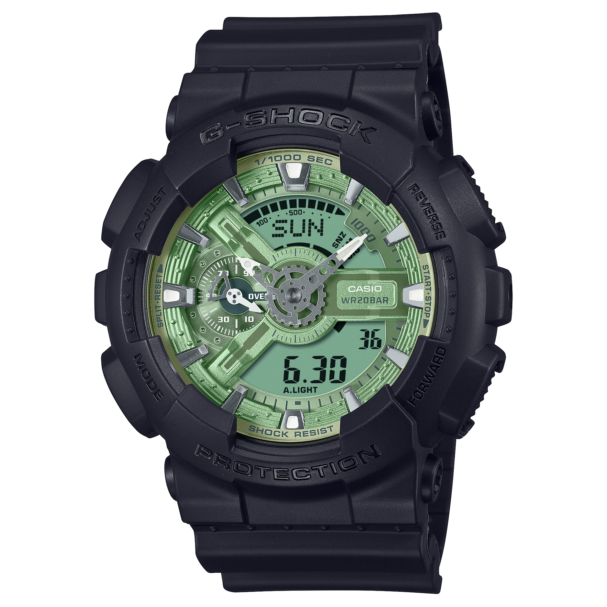 Make a bold statement with the GA-110CD-1A3DR G-SHOCK watch. Its distinct large case features a classic black band and bezel, with a bold pop of color on the dial. Choose from ice blue, sage green, or two-tone silver and gold. This stylish, street-savvy accessory adds a touch of rustic charm to any outfit.
