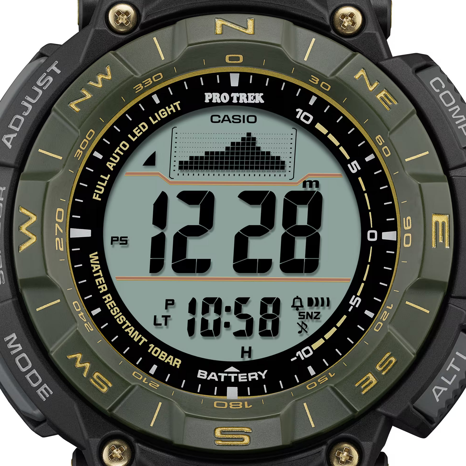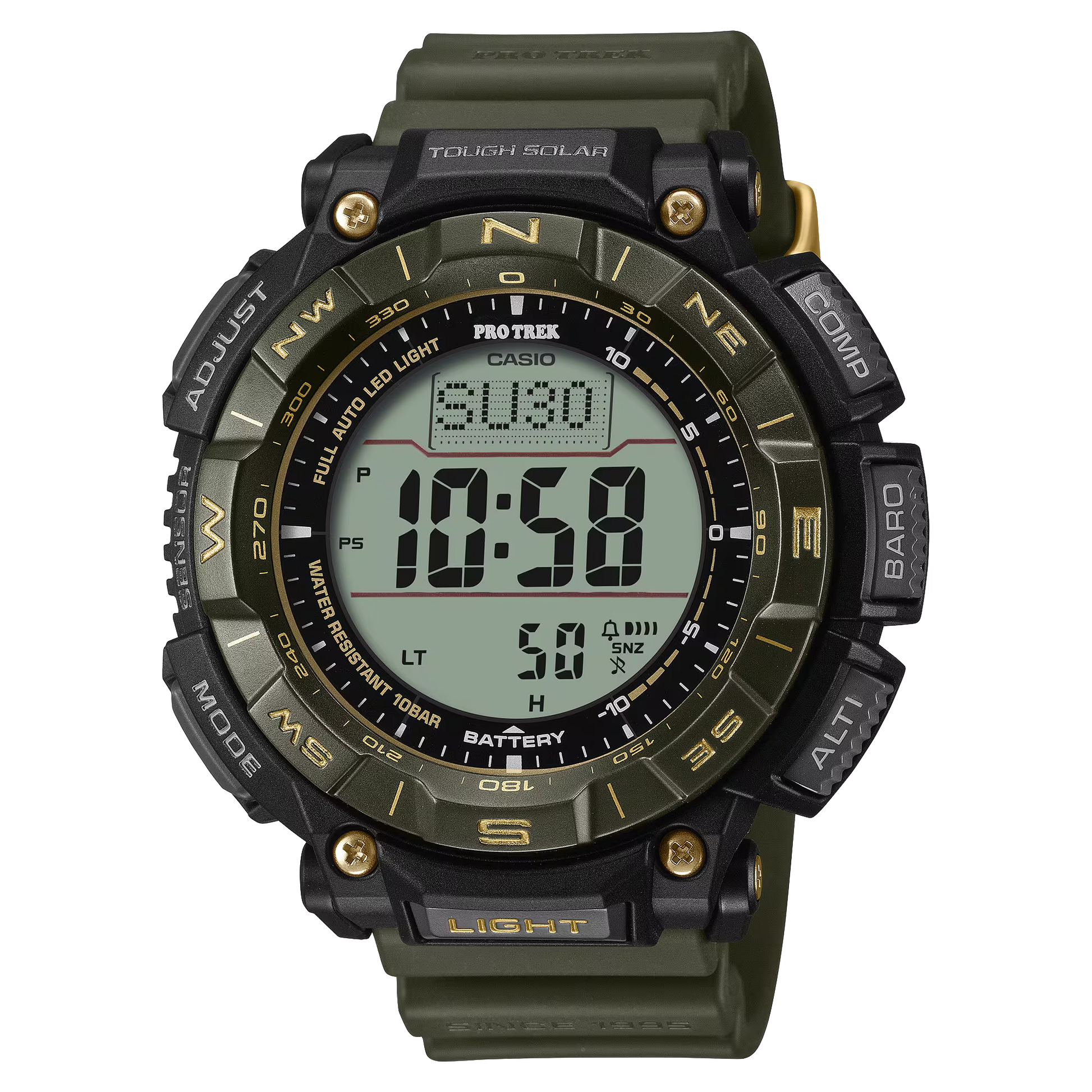The Triple Sensor delivers compass bearing, barometric pressure, altitude, and temperature readings. The Tough Solar charging system efficiently converts sunlight and indoor light into power, freeing you from battery worries when heading outdoors for extended periods. Water resistance up to 100 meters has your back in any environment.