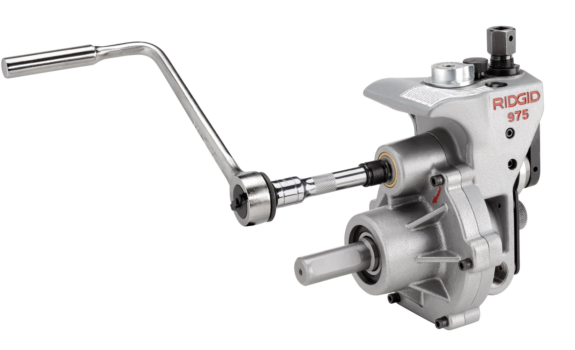 Ideal for in-field use, the Model 975 roll groover gives you two tools in one: choose by-hand or machine-powered operation. Couple with the RIDGID 300 Power Drive (sold separately) or use the included ½-inch (12.7) ratchet to complete grooving jobs on a variety of 1 1/4" (31.75 mm) to 6-inch (152.4 mm) steel, stainless steel, aluminum and PVC pipe. Roll sets are also available for copper tube. The cast-in handle allows for easy transport.