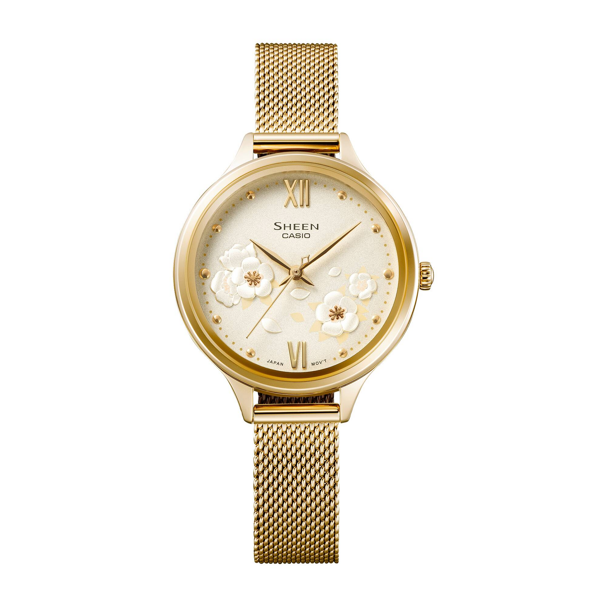 Introducing the SHEEN WOMEN ANALOG watch, inspired by the delicate and elegant hellebore flower. The dial features embossed petals with metal accents, while the leaves add depth with darker tones. The mesh band and mirror-finish case are plated in light yellow gold for a sophisticated metallic look. With scratch-resistant sapphire crystal and water resistance up to 50 meters, this watch is both stylish and practical.